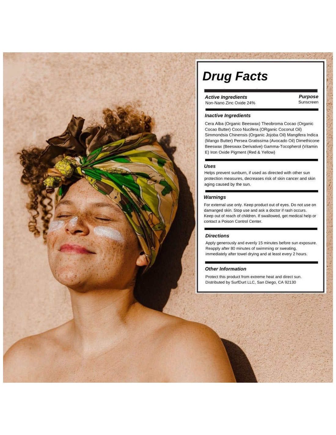 - BLOQUEADOR SOLAR MINERAL NATURAL: El único ingrediente activo de SurfDurt es seguro para ti y los arrecifes: óxido de zinc no nano. Esta base mineral incluye antioxidantes nutritivos e ingredientes derivados de alimentos: aceite de coco, aguacate y jojoba para protección solar.