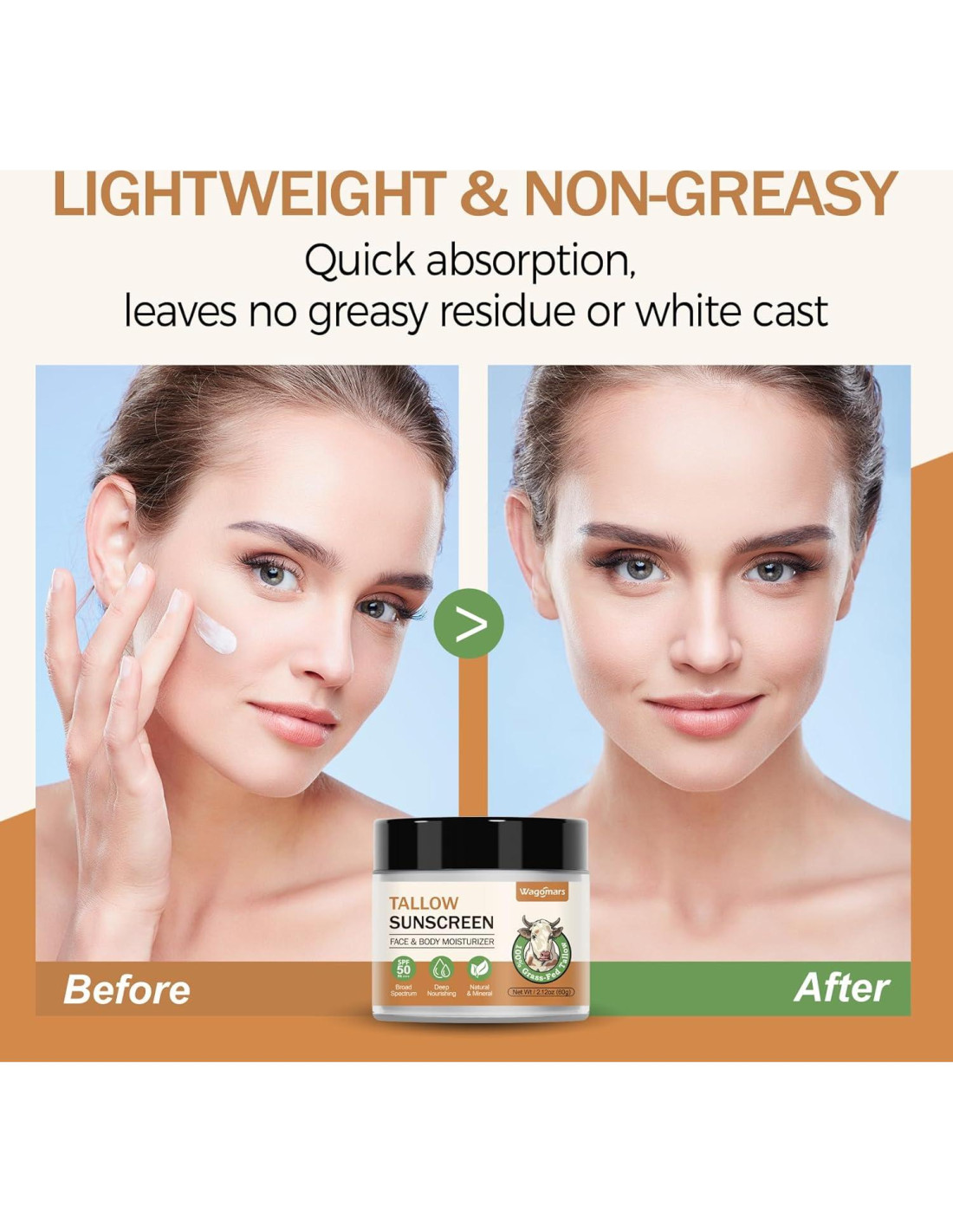 - Sin Residuos Blancos, Fórmula No Grasa: Este protector solar de sebo de res se aplica suavemente, se absorbe rápidamente y deja tu piel sintiéndose fresca y no pegajosa, sin ningún residuo blanco.