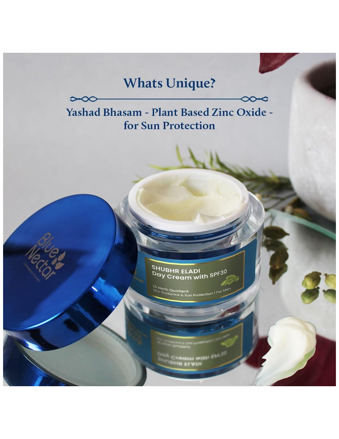 - Crema de Día para Hombres con SPF: Esta crema facial para hombres ayuda a proporcionar protección contra los dañinos rayos UVA y UVB. Esta crema de día o crema solar para hombres contiene Yashad Bhasma que proporciona protección SPF ayurvédica.