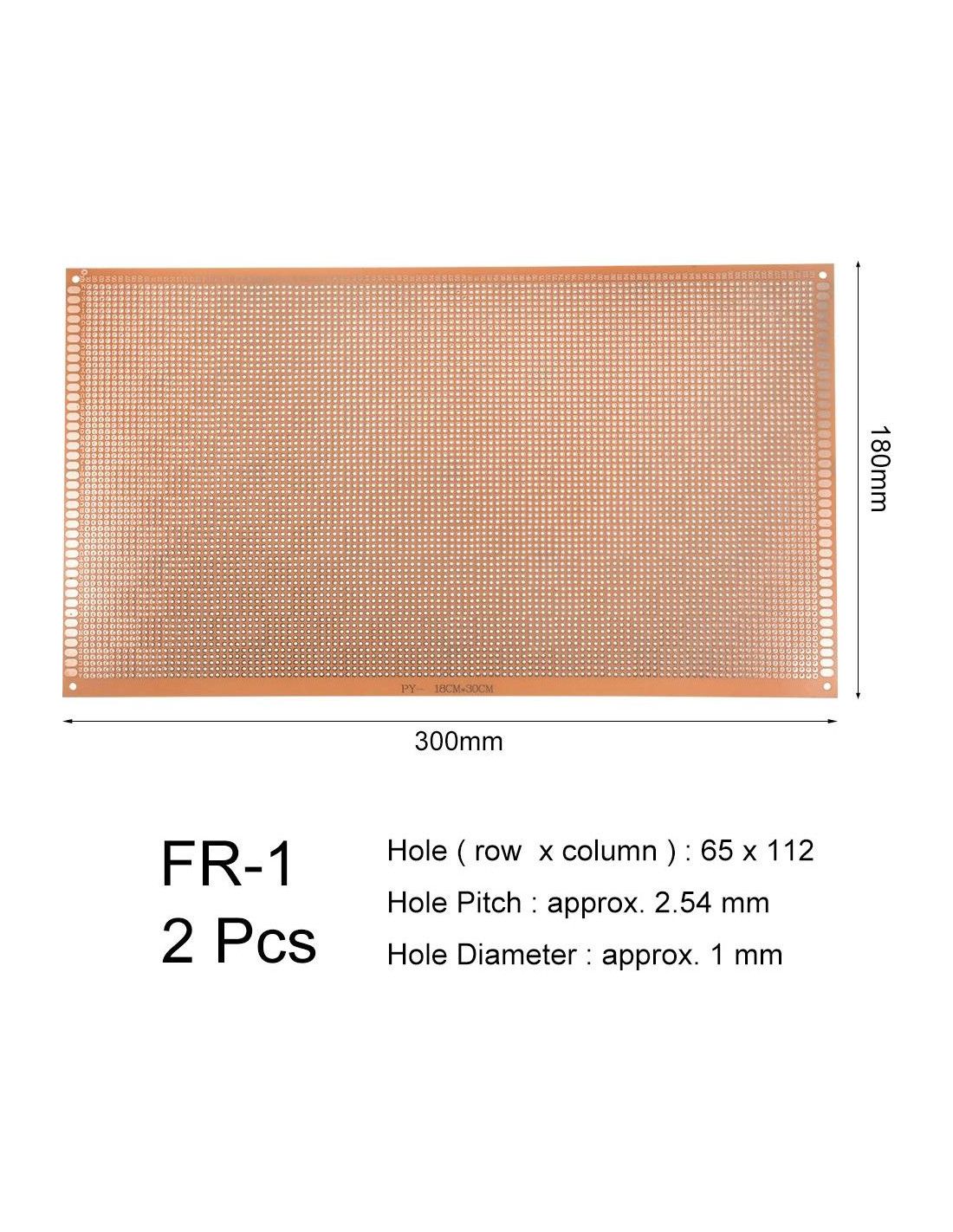 Especificaciones Dimensión: 18x30cm (An x L) Agujero (fila x columna): 65 x 112 Material: FR-1 94HB baquelita Grosor: aproximadamente 1.4mm Agujero Espaciado: aproximadamente 2.54 mm Diámetro del Agujero: aproximadamente 1 mm Diámetro del Agujero de Montaje: aproximadamente 3 mm Color: marrón básico, tono marrón Contenido del paquete: 2 pcs x Placa PCB Universal