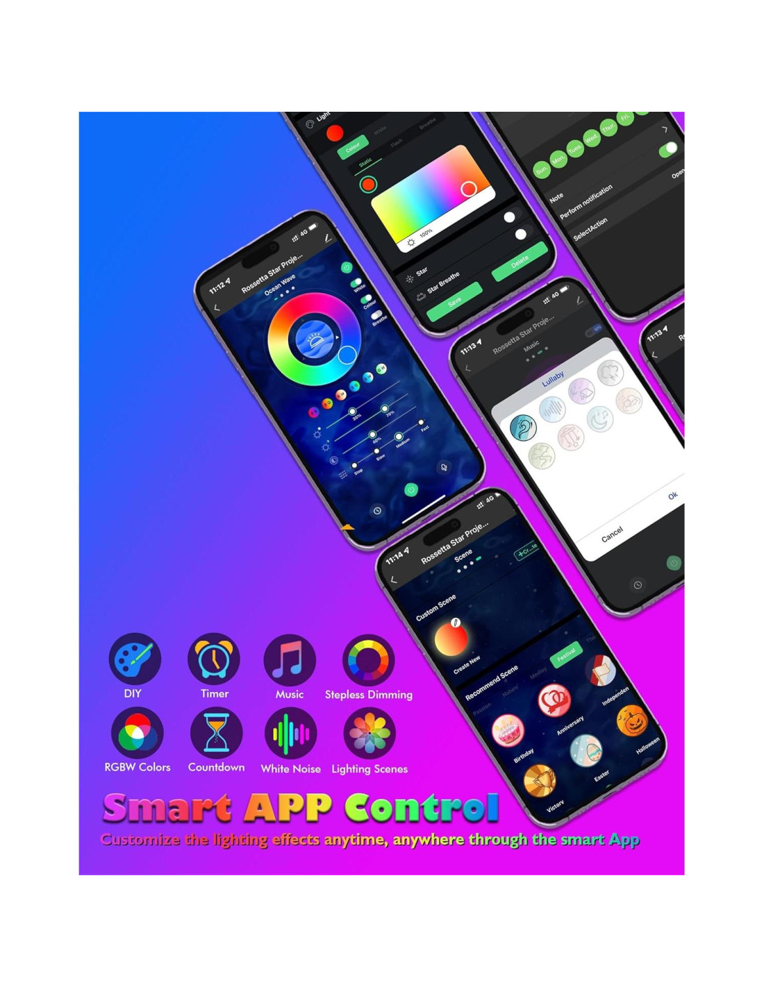 - Luces Sincronizadas con Música y Altavoces Bluetooth - Lleva la fiesta a tu habitación sincronizando tu reproductor de música con el proyector de luz Rossetta y observa cómo la luz estelar se mueve al ritmo del beat. También puedes conectar tu dispositivo de juego y añadir efectos de luz geniales a tu sala de juegos. Establece el ambiente ya sea relajándote mientras tomas un baño de burbujas o elevando la energía con luces intermitentes que mejorarán tu experiencia de fiesta. Controlas tu lista de reproducción a través del teléfono y reproducirá tu música.
