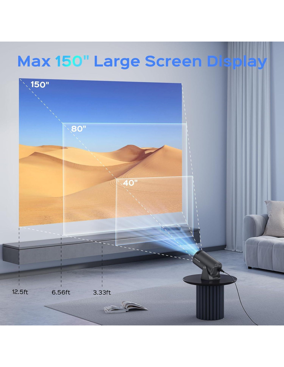 - [Diseño Rotable 180 & Pantalla Gigante de 150''] Experimenta la máxima flexibilidad con el diseño rotable de 180 del mini proyector Mentech, que permite la proyección en cualquier superficie, incluyendo techos, sin necesidad de instalación fija. Disfruta de una enorme pantalla de 150'', convirtiendo cualquier espacio en un teatro inmersivo. Con una fuente de luz de larga duración de hasta 50,000 horas, es perfecto para películas, juegos y deportes.