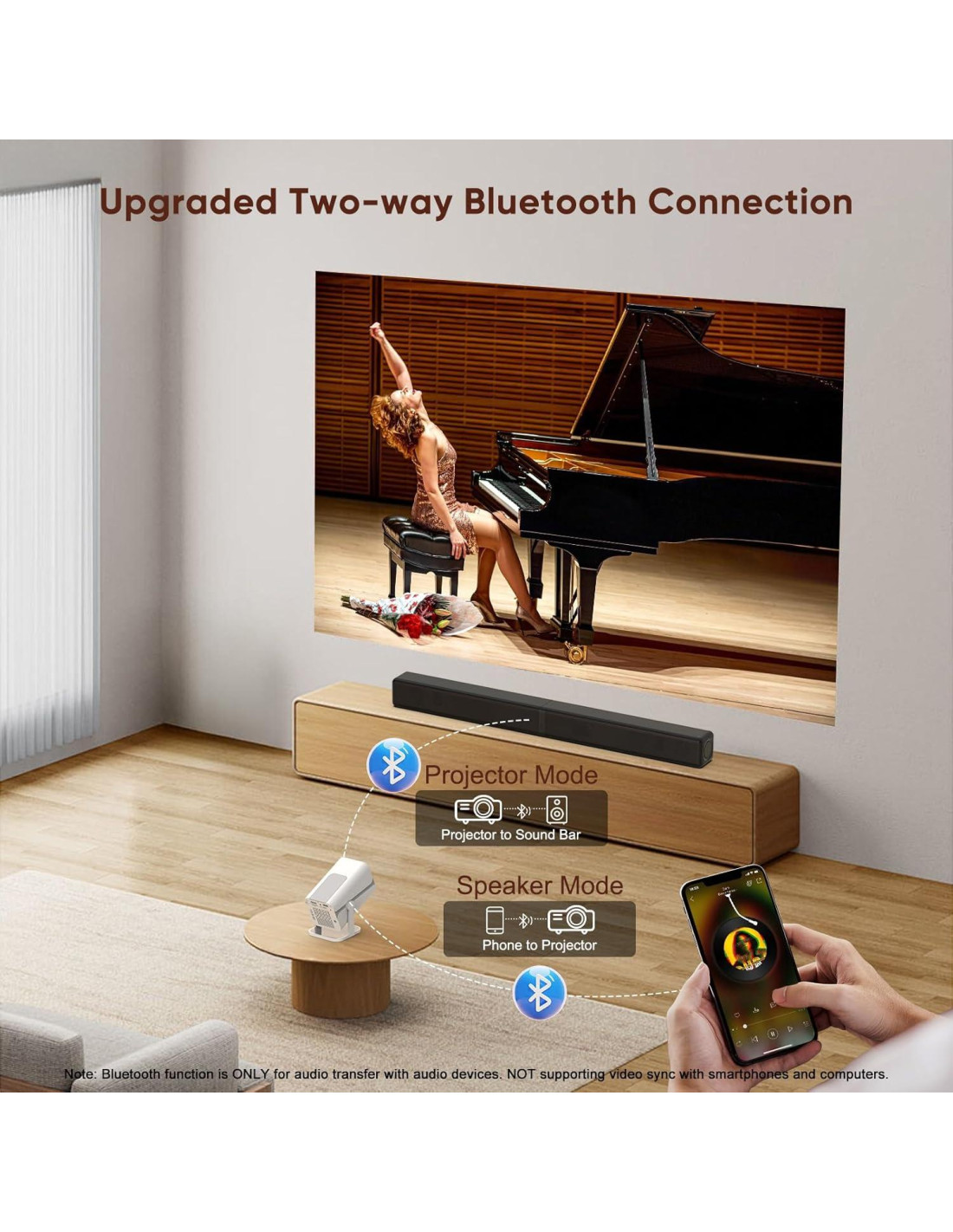 - [Altavoz Estéreo Integrado y Bluetooth Mejorado Bidireccional] El proyector con altavoces de 3w integrados, ofrece un sonido cristalino y lo suficientemente fuerte, perfecto para dormitorios pequeños o noches de cine acogedoras. Para una experiencia aún más rica, la capacidad de Bluetooth te permite emparejarte fácilmente con altavoces externos, barras de sonido o auriculares. Perfecto para amplificar noches de cine al aire libre, fiestas en el patio trasero o sesiones de visualización privadas; también puedes usar el proyector como un altavoz independiente a través de la conexión Bluetooth con tu teléfono (solo para transferencia de audio).