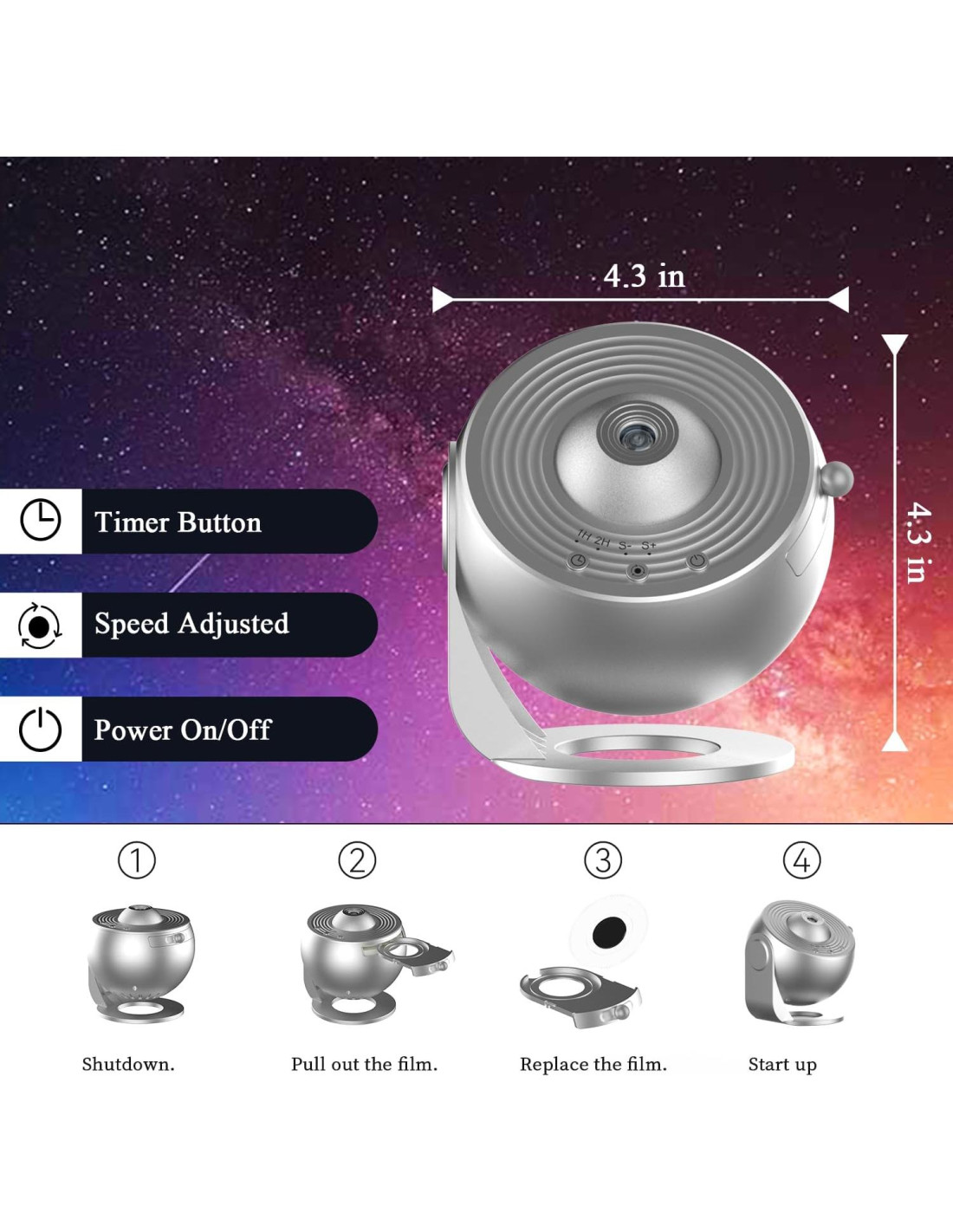 - Ayuda para Dormir Ultra-silenciosa y Temporizador de Apagado Automático - Esta luz de proyector de estrellas opera en silencio, asegurando un ambiente pacífico para dormir. Puedes confiar en la función de temporizador incorporada para apagar automáticamente el proyector espacial, eliminando cualquier preocupación de olvidarlo. La lámpara de galaxia crea una atmósfera de sueño serena y tranquila, ayudando tanto a ti como a tu hijo a conciliar el sueño. Ten en cuenta que la imagen proyectada rota a un ritmo deliberadamente lento para simular con precisión la rotación natural del cielo estrellado.