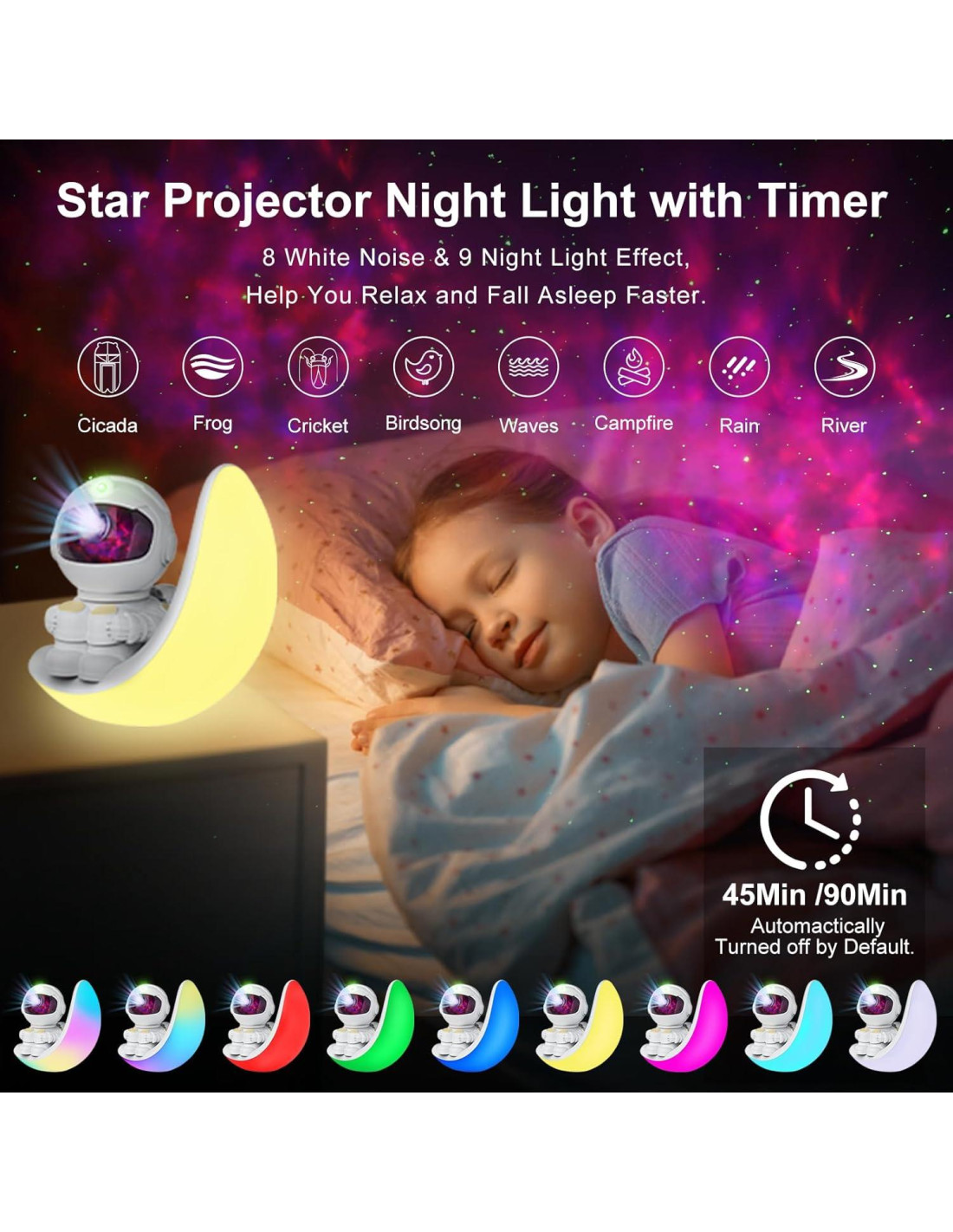 - [Proyector Galáctico de Estrellas 5 en 1 Mejorado para Decoración de Habitaciones] Experimenta la combinación definitiva de un adorable astronauta, lámpara lunar, altavoz de música, máquina de ruido blanco, nebulosa cautivadora y efectos de luz estelar en un solo dispositivo. Este proyector galáctico de estrellas no solo proyecta ocho efectos de luz hipnotizantes, incluyendo una combinación de nebulosa y estrellas centelleantes, sino que también funciona como una luz nocturna con nueve colores relajantes. Transforma tu dormitorio en un impresionante entorno de estrellas que brillan en la oscuridad y disfruta de un sueño reparador con este imprescindible proyector galáctico de estrellas.