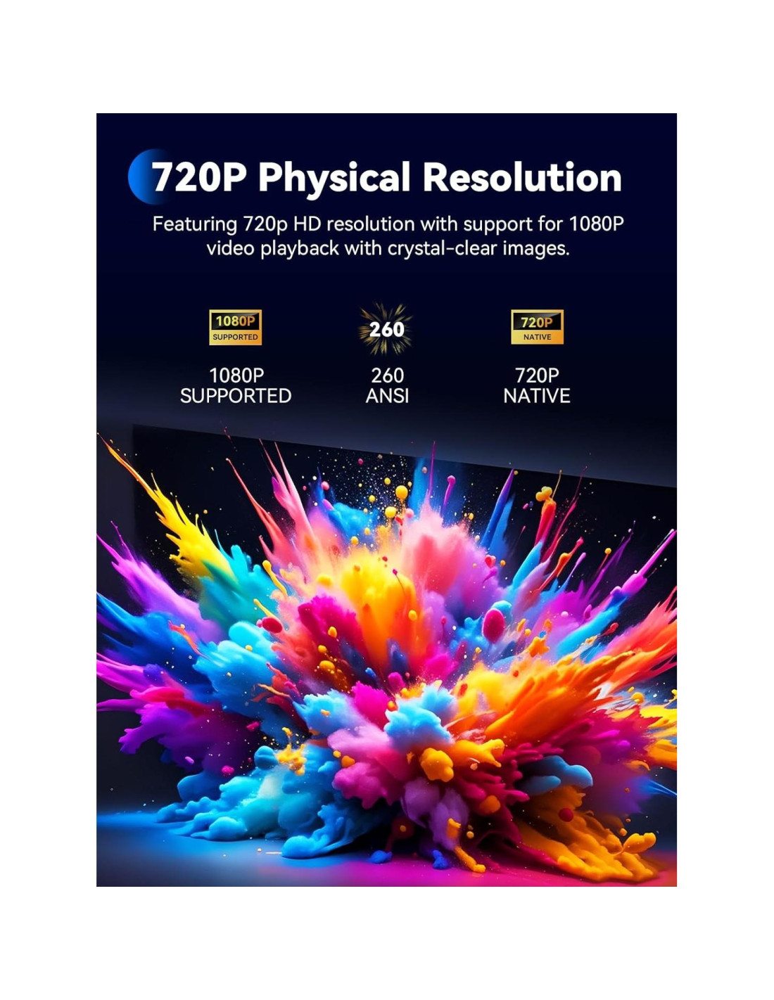 - Calidad de Imagen de Siguiente Nivel: Experimenta una claridad impresionante con soporte de entrada 1080p y una pantalla nativa de 720p, mejorada por 260 lúmenes de brillo para visuales vibrantes y realistas. Ya sea que estés transmitiendo películas o jugando, cada detalle resalta con brillantez cinematográfica. Además, la tecnología de reflexión difusa de cuidado ocular del proyector de video reduce la fatiga visual, para que puedas disfrutar de sesiones de visualización más largas sin incomodidad.