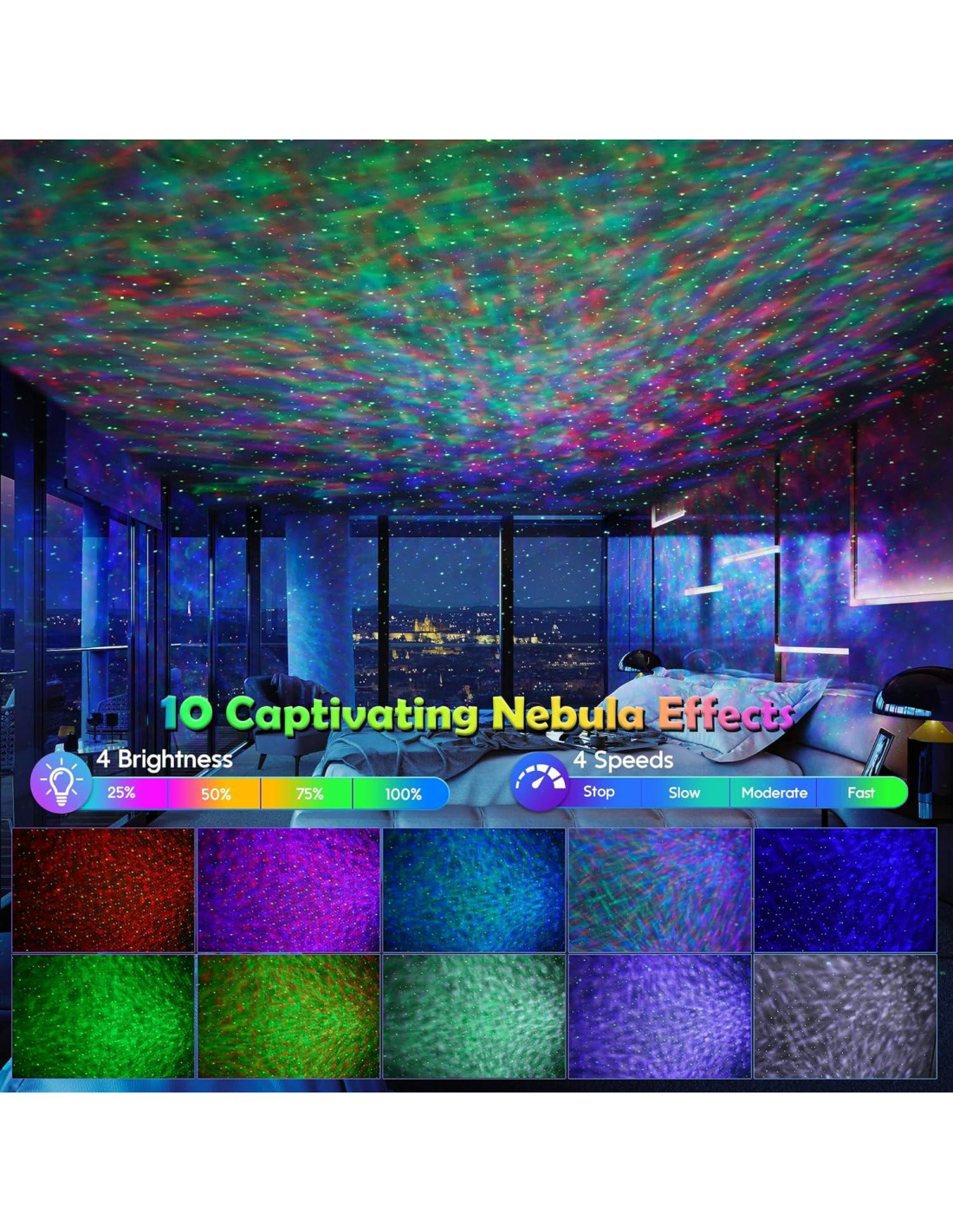- Efectos de Nebulosa Cautivadores Sumérgete en impresionantes efectos de nebulosa acompañados de estrellas verdes presentados por el proyector de estrellas FlyEagle. 15 nebulosas, 4 velocidades de rotación y 4 niveles de brillo ajustables están disponibles en este proyector de galaxia para dormitorio.