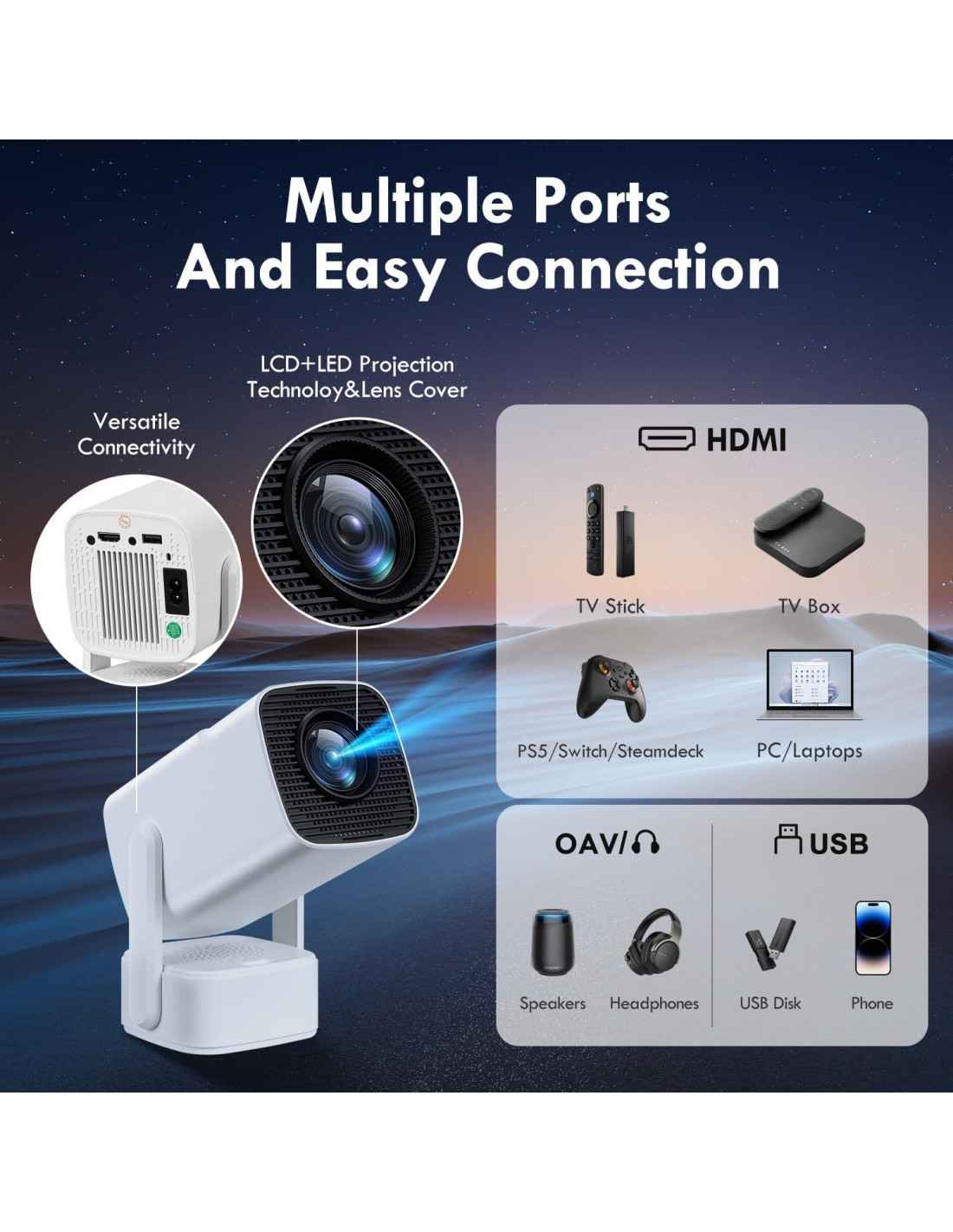 - [Ajuste Flexible y Proyección de Pantalla Grande] Equipado con un soporte rotatorio de 180 grados, te permite ajustar fácilmente el ángulo de proyección. Puede proyectar imágenes claras en pantallas de 30 a 130 pulgadas, transformando tu sala de estar u otras áreas de tu hogar en un verdadero cine.