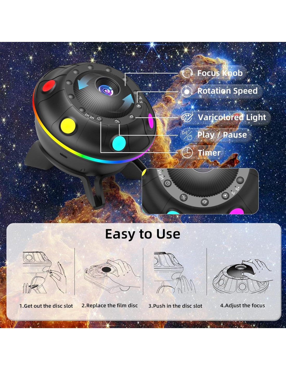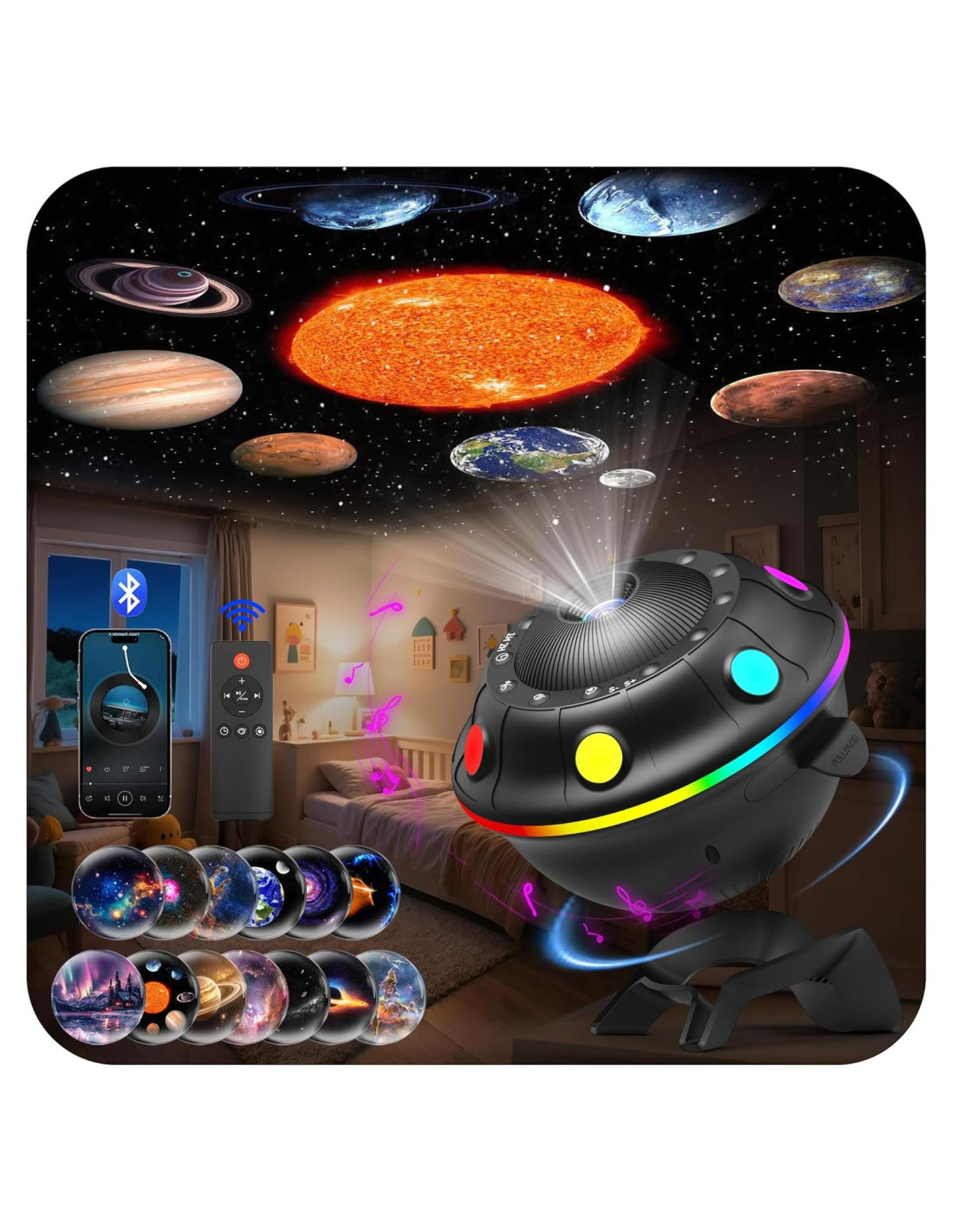 - [6-en-1 Proyector Multifuncional UFO] proyector de estrellas (con 13 discos de película intercambiables), luz nocturna RGB, ruido blanco, temporizador de apagado automático, altavoz Bluetooth y control remoto. Proyecta constelaciones vívidas y detalles nítidos de nebulosas en paredes, techos o pisos. Su suave rotación galáctica imita los movimientos celestiales reales, creando una atmósfera espacial impresionante. Controlado sin esfuerzo a través del control remoto, es ideal para cada ocasión: noches de cine, citas románticas, sesiones de juego, decoración de habitaciones con temática espacial, fiestas de cumpleaños, bodas y reuniones navideñas. Más que una pieza decorativa, es un regalo reflexivo para cualquiera que quiera disfrutar de impresionantes vistas de galaxias y nebulosas desde la comodidad del hogar.