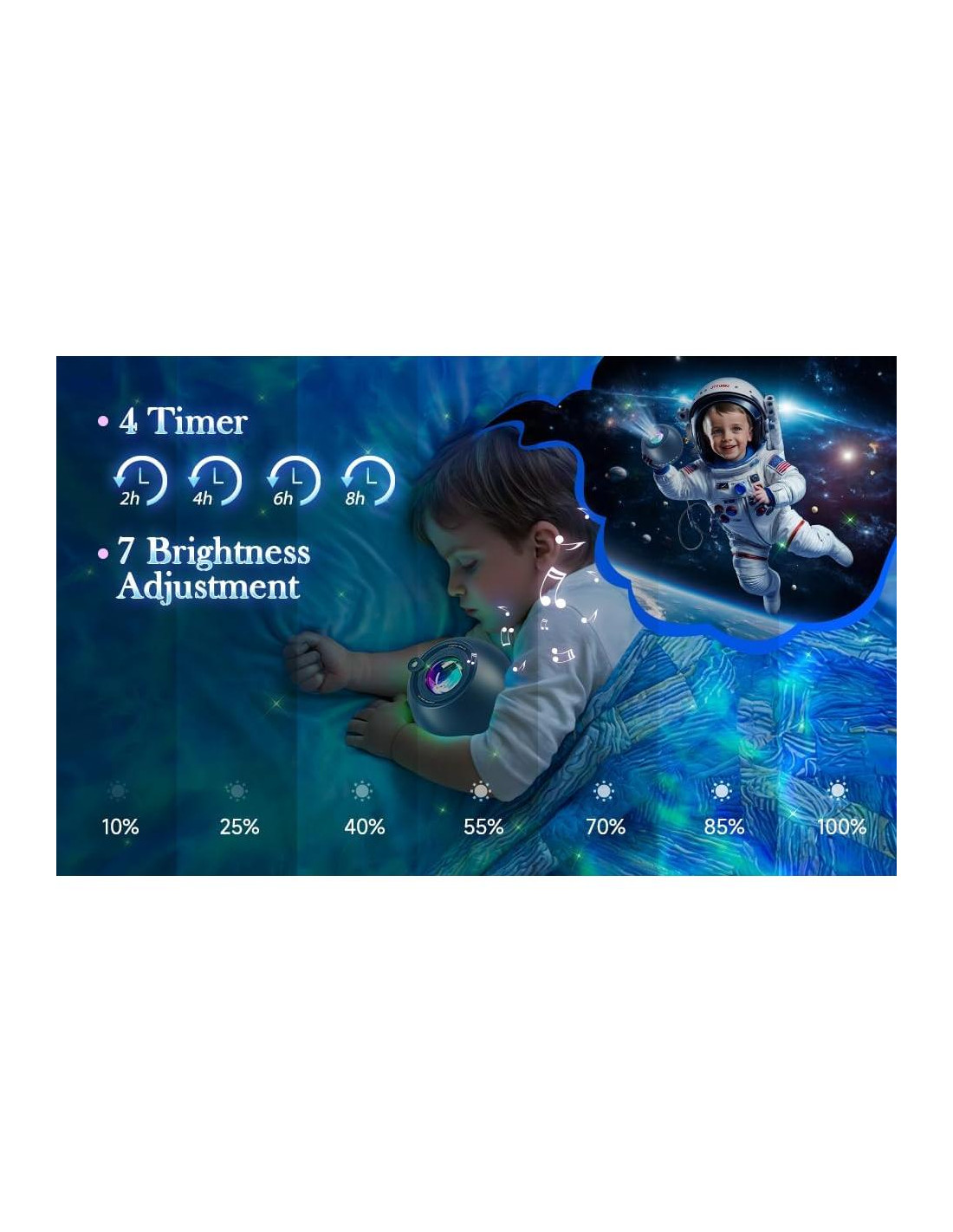 - TEMPORIZADORES AUTOMÁTICOS + 6 MODOS DE BRILLO DEL PROYECTOR DE ESTRELLAS: Cuando intentas dormir, no te preocupes por que el proyector de luz galáctica para dormitorio y las luces del proyector para dormitorio estén encendidas toda la noche. Puedes configurarlo para que se apague después de 2/4/6/8h. El proyector galáctico para dormitorio y la lámpara galáctica crean luces geniales! Solo configura el TEMPORIZADOR, ya no necesitas apagar las luces de estrellas para el proyector de techo. El proyector galáctico para dormitorio y la luz nocturna del proyector de estrellas para la habitación de los niños y las luces del proyector de estrellas para el dormitorio. Nuestras luces del proyector para el dormitorio están diseñadas con 6 modos de brillo (15-30-45-60-80-100%). Puedes ajustar el brillo de la luz del proyector de estrellas y la lámpara galáctica para que sea más cómoda para los ojos.