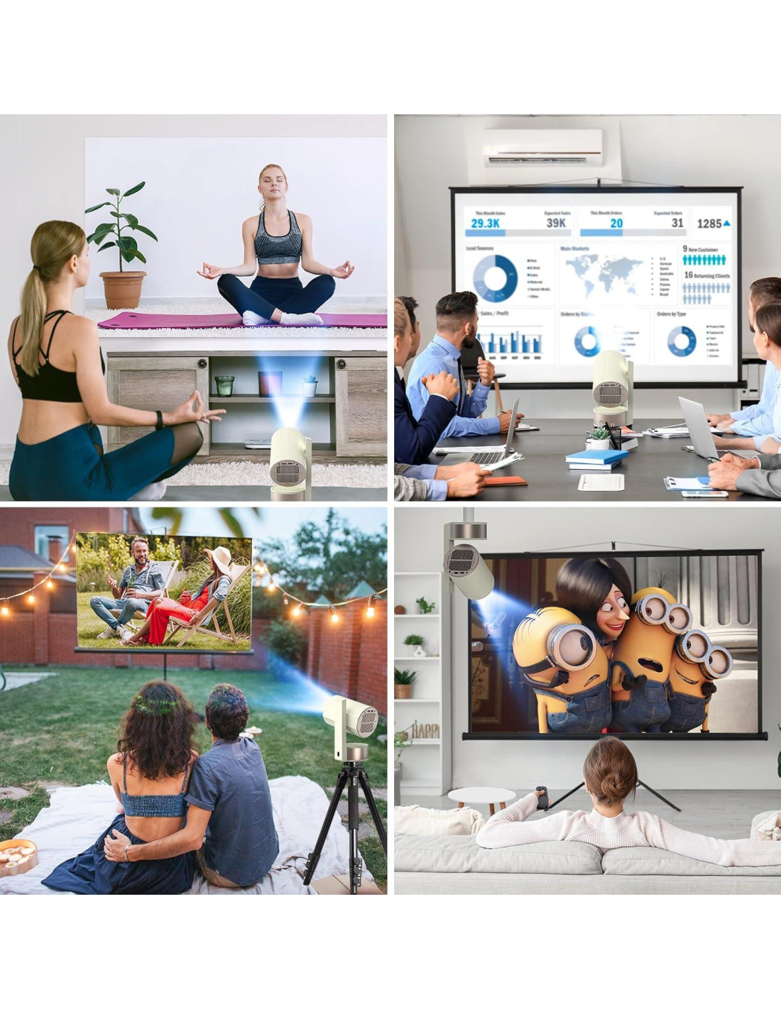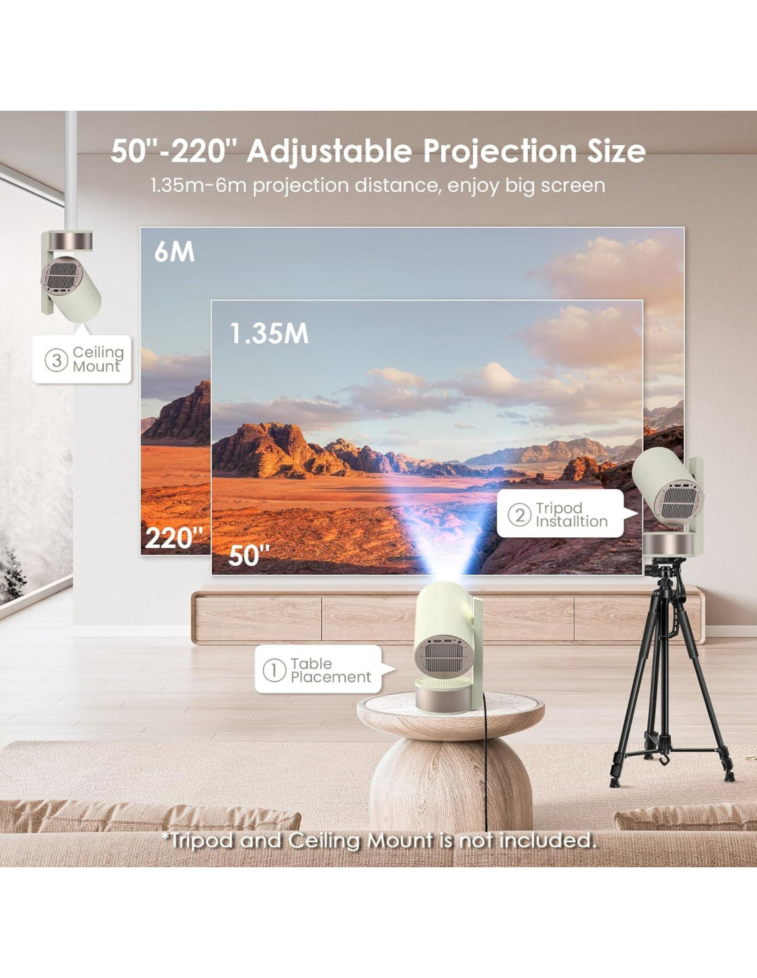 - Proyector Portátil Rotable 270: La base del proyector 4k viene con un soporte rotatorio de 270 que permite que el proyector apunte en una variedad de direcciones, incluyendo de la pared al techo. Puedes ver desde cualquier ángulo y obtener una imagen clara.
