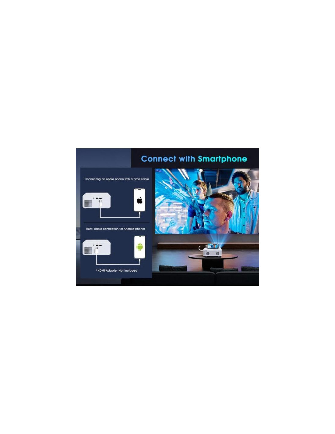 - [Plug & Play, Conectar a Smartphone] Todos sabemos que el WiFi puede causar retraso en la señal, pero una conexión por cable de teléfono a proyectores HDMI proporcionaría una señal más estable. Especialmente cuando sales de viaje o tienes una fiesta nocturna al aire libre, es difícil encontrar WiFi. Este proyector incluye un cable HDMI 3 en 1 que es compatible con teléfonos y tabletas, plug and play sin cables de controlador adicionales, solo conecta tu teléfono/computadora, conéctalo al proyector, puedes pasar un buen rato en fiestas en el jardín, noches de cine en el patio trasero, camping al aire libre y más.