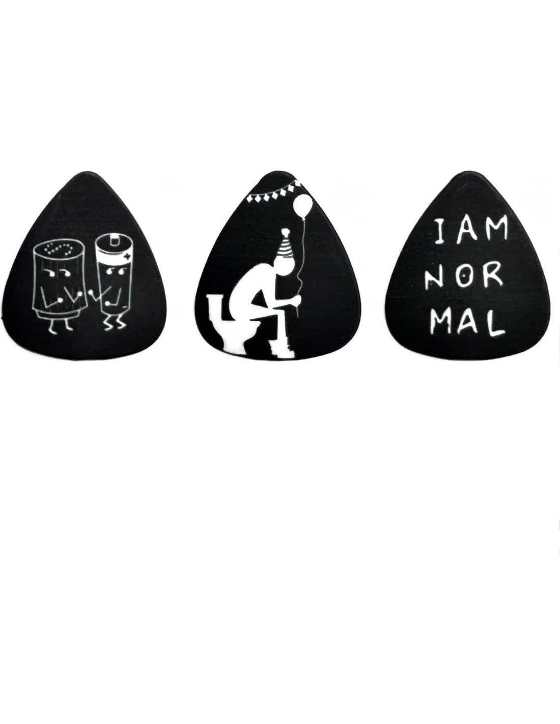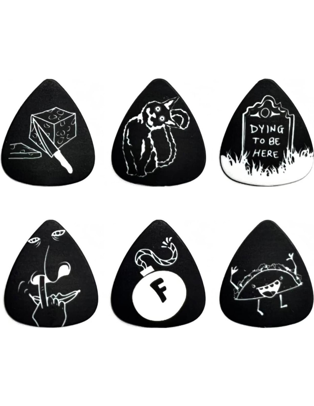 Púas de guitarra divertidas, creativas y geniales para guitarristas. ¡No más púas de guitarra aburridas! Eleva tu experiencia de tocar con estas púas únicas. Presentan diseños juguetones y personajes peculiares. Añadirán una dosis de humor a tu interpretación y también son excelentes iniciadores de conversación en sesiones de jam. Este producto incluye diez (10) púas de guitarra divertidas y un estuche para llevarlas. Cada púa de guitarra individual muestra su propia ilustración única. Las púas de guitarra son negras con ilustraciones blancas. Genial para músicos con un buen sentido del humor y aquellos que pueden apreciar un mal juego de palabras. El estuche de transporte es pequeño y se transporta bien. Ya seas un guitarrista experimentado o estés comenzando tu viaje musical, estas púas son imprescindibles para cualquier músico que busque añadir un toque de estilo a su interpretación. Elaboradas con precisión y hechas de materiales de alta calidad, nuestras púas de guitarra aseguran una durabilidad excepcional y un agarre cómodo, permitiéndote tocar con facilidad y confianza. Ya sea que estés rasgueando una guitarra acústica o tocando riffs en una eléctrica, nuestras púas ofrecen el equilibrio perfecto entre flexibilidad y resistencia. El estuche de metal está hecho de estaño, es compacto y puede soportar golpes. La parte superior se desliza para abrirse, hace clic al cerrarse y se mantiene cerrada. ¿Por qué conformarte con púas de guitarra ordinarias todo el tiempo? Desata tu creatividad e infunde tu música con personalidad. ¡Que comience la diversión! Y agradece a ti mismo por cambiar las cosas de vez en cuando. Ya sea que saques sesiones micro de tu apretada agenda (juego de palabras intencionado) o toques todo el tiempo, disfrútalo. Te lo mereces. Exprésate con un dedo de pájaro. ¡Tómalo y rockea!