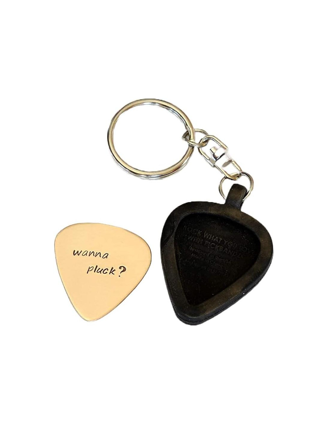 pua de guitarra de cobre hecha a mano con la frase estampada a mano " tú rockeas mi mundo " en un soporte de llavero de pua de guitarra de pickbandz la pua de cobre es jugable y mide 2.79 cm por 2.79 cm por 0.1 cm de grosor regalo perfecto para tu guitarrista