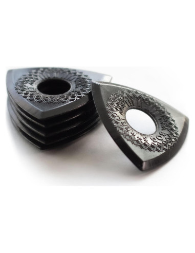 Excelente para guitarra eléctrica. Maneja bien el juego de alto rendimiento con un ataque rápido y suave de la pua. La Battle Axe está diseñada para complementar y mejorar la técnica, el control y la articulación. Presenta nuestro agarre ergonómico patentado, que incorpora contornos, un corte central y una textura de agarre elevada para ayudarte a mantener un agarre firme mientras tocas. También expande la versatilidad de las puas "normales" al ofrecer tres puntas biseladas idénticas. No importa con qué punta toques, obtendrás el mismo gran rendimiento. ¡Es como tener tres puas en una! Similar en tamaño y forma a las puas de estilo "jazz", la Battle Axe es una gran opción para los jugadores que buscan una excelente combinación de velocidad, articulación y control. La Battle Axe ofrece bordes suaves para una liberación de cuerdas sin problemas.