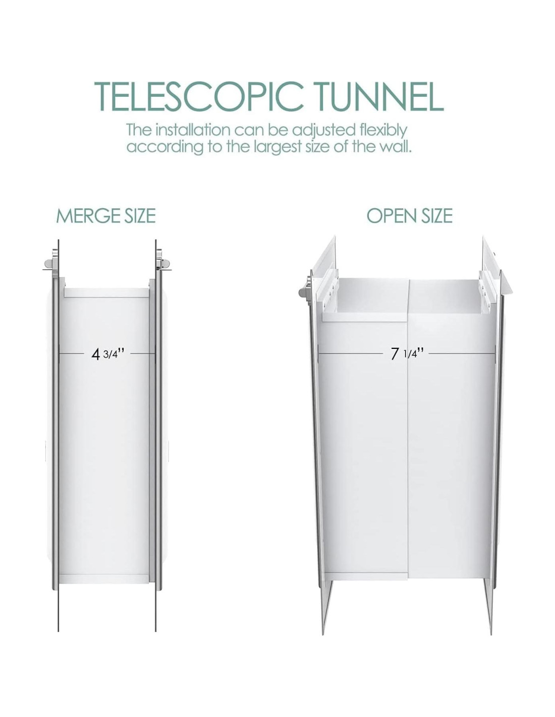 - DIMENSIÓN Y ANCHO TELESCÓPICO: El túnel telescópico se adapta a paredes que tienen un grosor de 12,07 - 18,42 cm. Apertura de la aleta: 26,04 cm de ancho x 41,28 cm de alto. Marco: 36,20 cm de ancho x 53,50 cm de alto. Corte en la pared: 30,48 cm de ancho x 44,45 cm de alto.