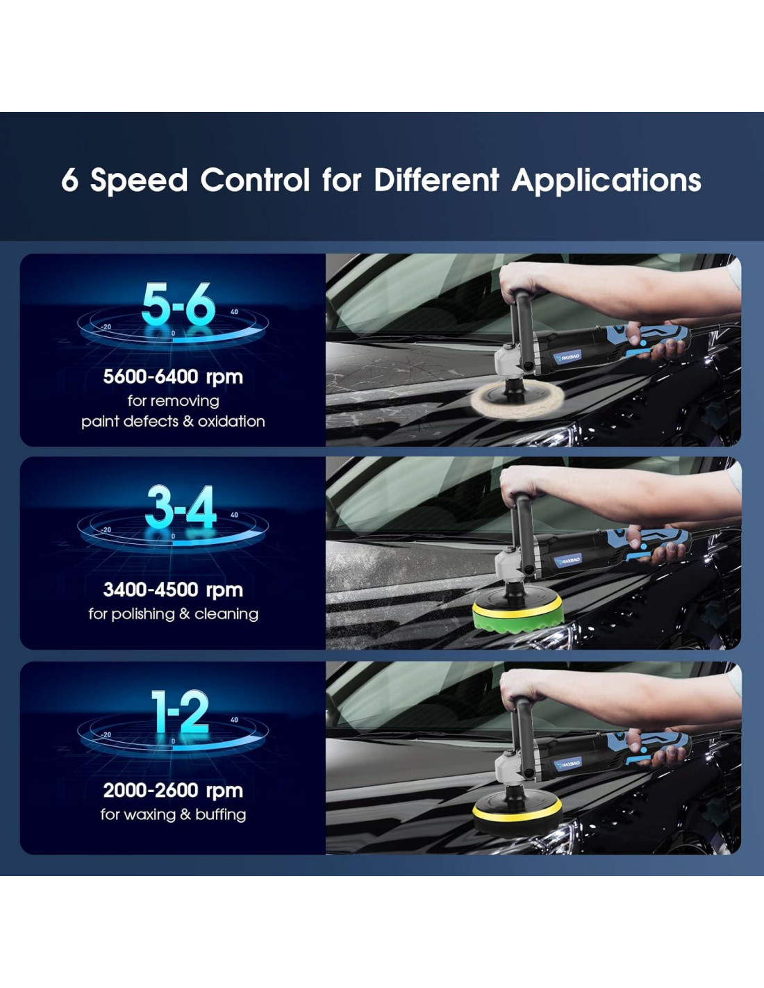 - 6 Pulidor de velocidad variable El dial de control de velocidad variable de 6 velocidades permite ajustar la velocidad del pulidor de coche de 1600 a 3500RPM según diferentes aplicaciones. Baja velocidad (1-2) para encerado y pulido; Velocidad media (3-4) para pulido y limpieza; Alta velocidad (5-6) para eliminar defectos de pintura y oxidación.