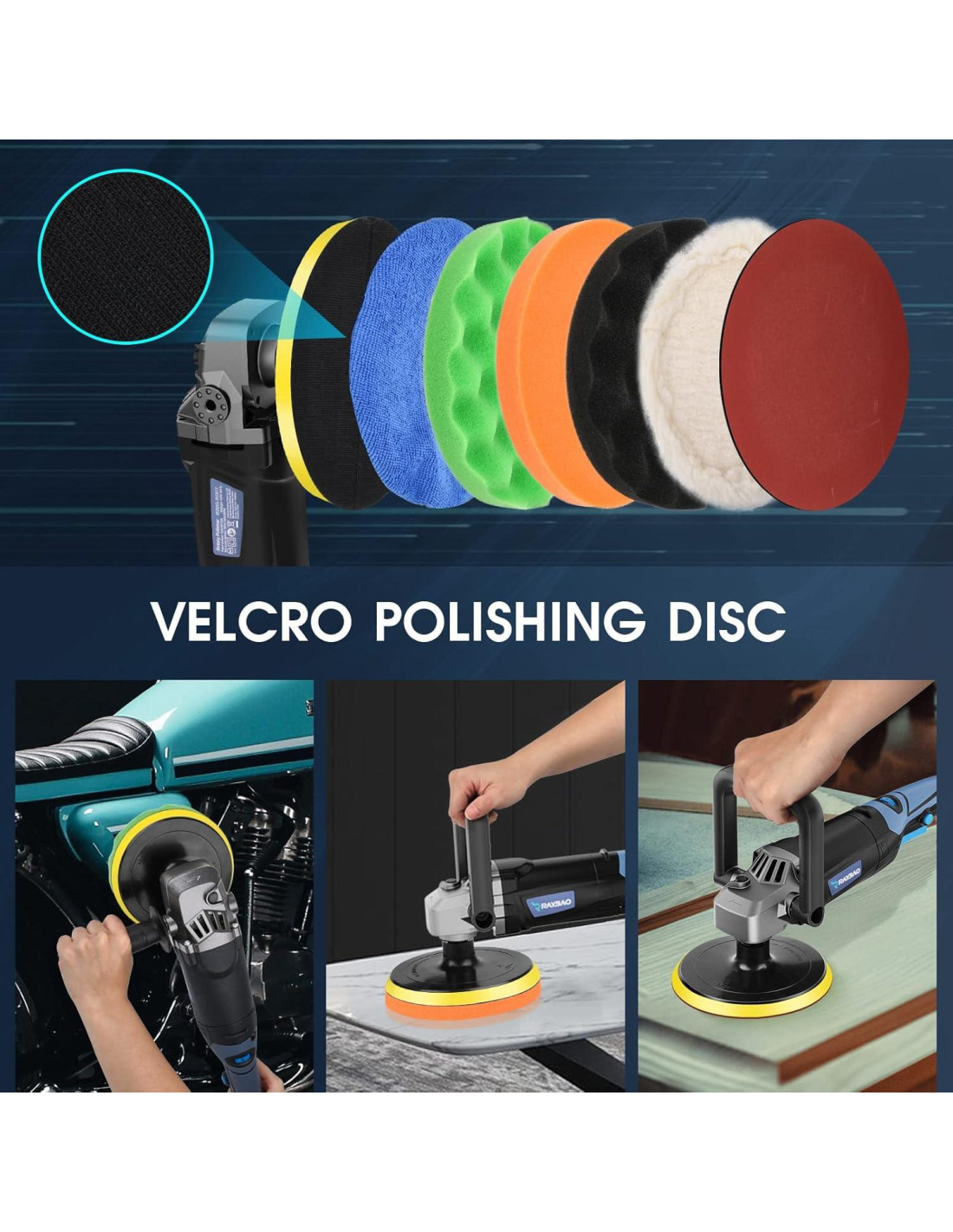 - Hace todo el trabajo El kit de pulidores y buffers RAYBAO incluye papel de lija, almohadillas de pulido finas y ásperas para encerado, almohadilla de pulido de lana, bonete de encerado, y más. Puedes usar diferentes almohadillas de pulido para terminar diferentes aplicaciones, como pulido, eliminación de remolinos, rayones y defectos de todos los vehículos pintados. También puedes usarlo en barcos, muebles, cerámica, madera y metal.