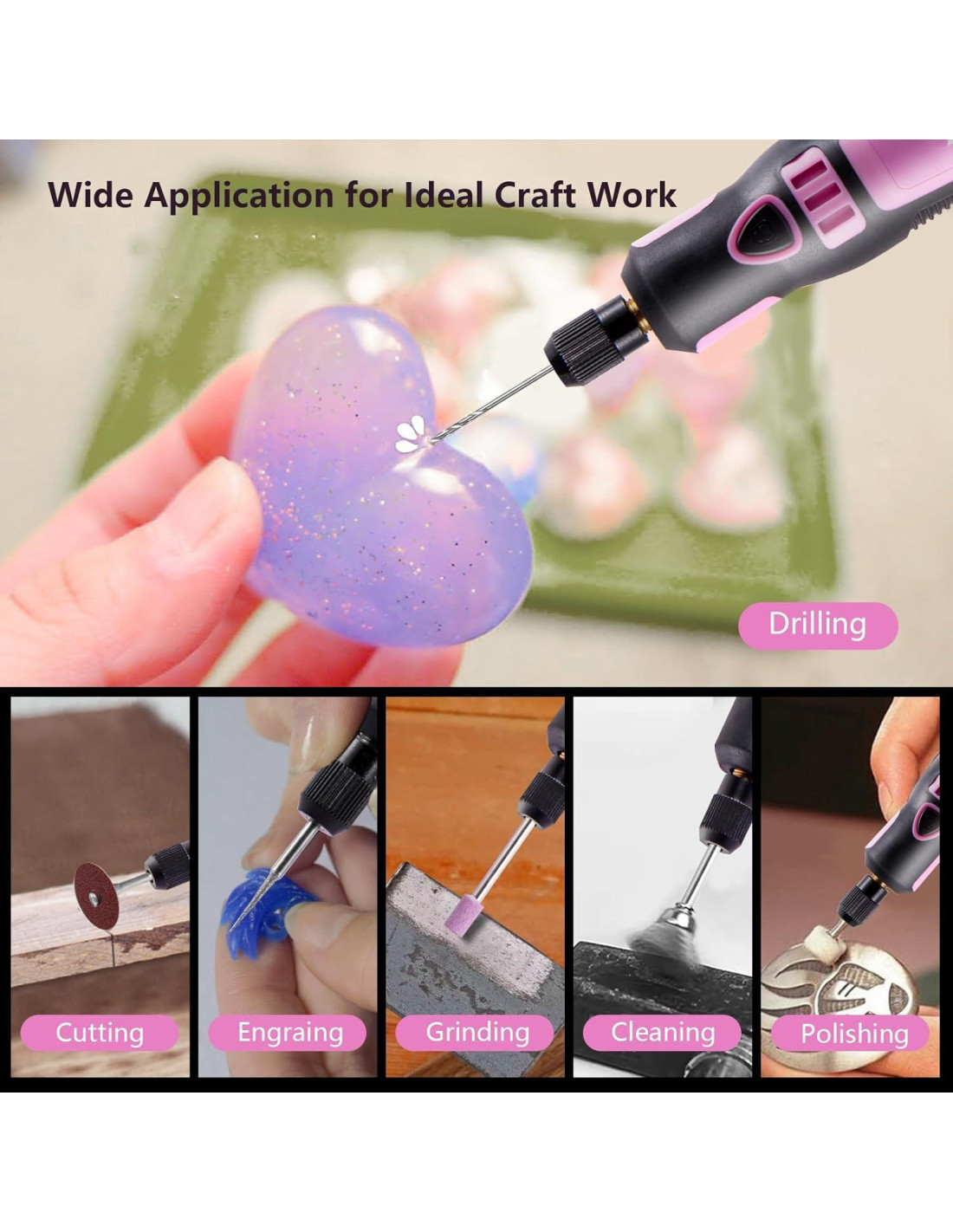 - Componentes incluidos: 1 herramienta rotativa inalámbrica, 1 mini tornillo de banco, 10 brocas y portabrocas, 12 brocas de grabado, 12 ruedas de molienda, 12 bandas de lijado, 1 piedra de afilar, 2 cabezales de molienda de lana, 10 papeles de lija, 10 piezas de corte de resina, 10 piezas de corte de malla doble, 10 cabezales de cepillo, 1 abrazadera plana mini, 1 abrazadera de banco mini, y 1 cable de carga USB.