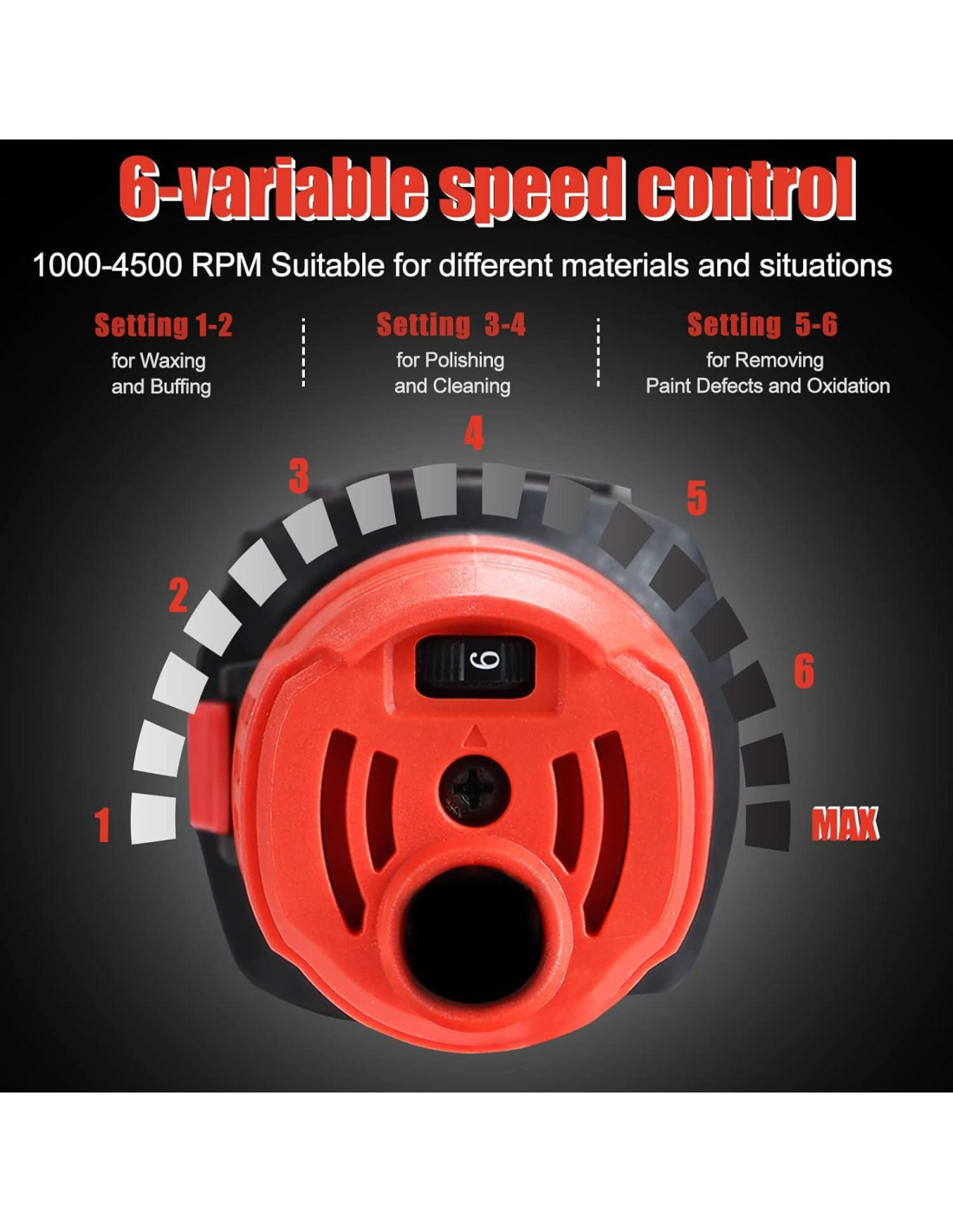 - 6 VELOCIDAD PULIDOR ELÉCTRICO 120V, 60Hz, 700W, pulidor de 6 pulgadas; acción dual movimiento orbital aleatorio de cobre para un movimiento óptimo que logra un acabado sin remolinos 6 velocidades diferentes, se puede ajustar a diferentes velocidades de 1000 a 4500 rpm para diferentes materiales y aplicaciones. para lijado de coches, pulido, encerado, sellado de brillo, baja velocidad para encerado y pulido; velocidad media para pulido y limpieza mientras que alta velocidad para eliminar defectos de pintura y oxidación.