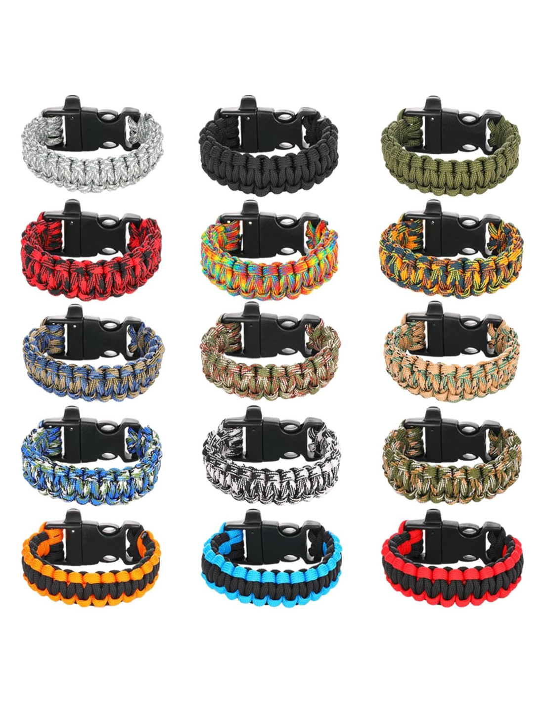 - PAQUETE DE PULSERAS DE SUPERVIVENCIA: ¡Estás de suerte! Obtendrás 15 piezas de pulseras de supervivencia paracord de diferentes colores. Estas pulseras trenzadas a mano están hechas de la mejor calidad, cuerda paracord fuerte y duradera. Están diseñadas para ser ajustadas y cómodas, lo que las convierte en una excelente opción para actividades al aire libre y deportes