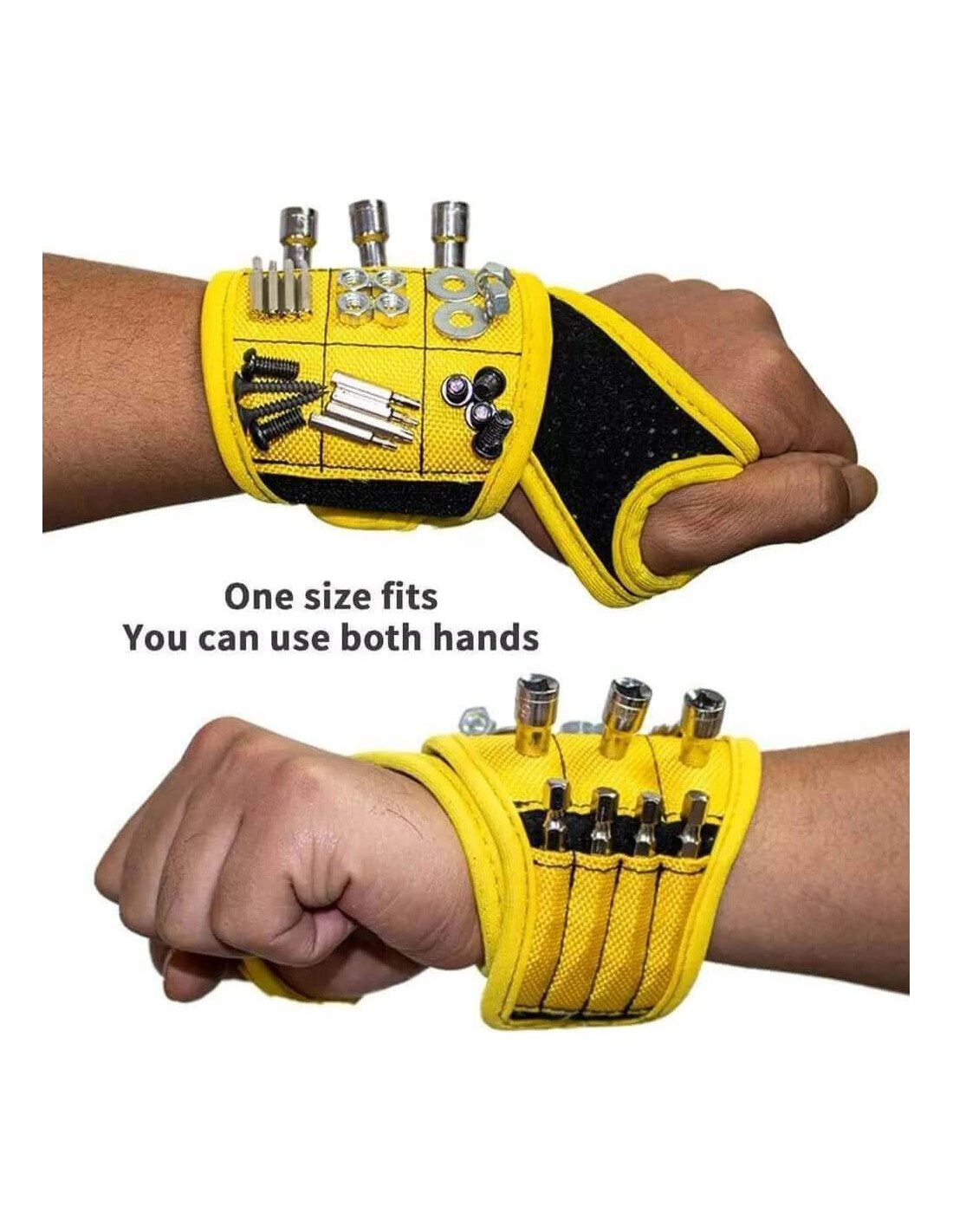 Estos gadgets simples y geniales te ayudarán a llevar tus dispositivos contigo; No te preocupes por perder o dejar caer tornillos, clavos, pernos, arandelas, pasadores, agujas, brocas, sujetadores y herramientas pequeñas. Diseño elegante y práctico, un gran regalo para el día del padre, esposo, novios, manitas, carpintería, artesanos. 1. Hecho de poliéster balístico de alta gama 1680D con una capa de malla transpirable, que es cómoda y transpirable. 2. Construido en 3 filas de 9 super imanes y 4 bolsas, puede acomodar herramientas pequeñas de hierro. 3. El diseño de cierre ajustable de alta calidad de 46 cm de longitud permite que la pulsera magnética se ajuste a cualquier tamaño de muñeca. 4. Ligero y compacto, fácil de llevar y almacenar, mejora la eficiencia del trabajo. El paquete incluye: 1 x Pulsera Magnética