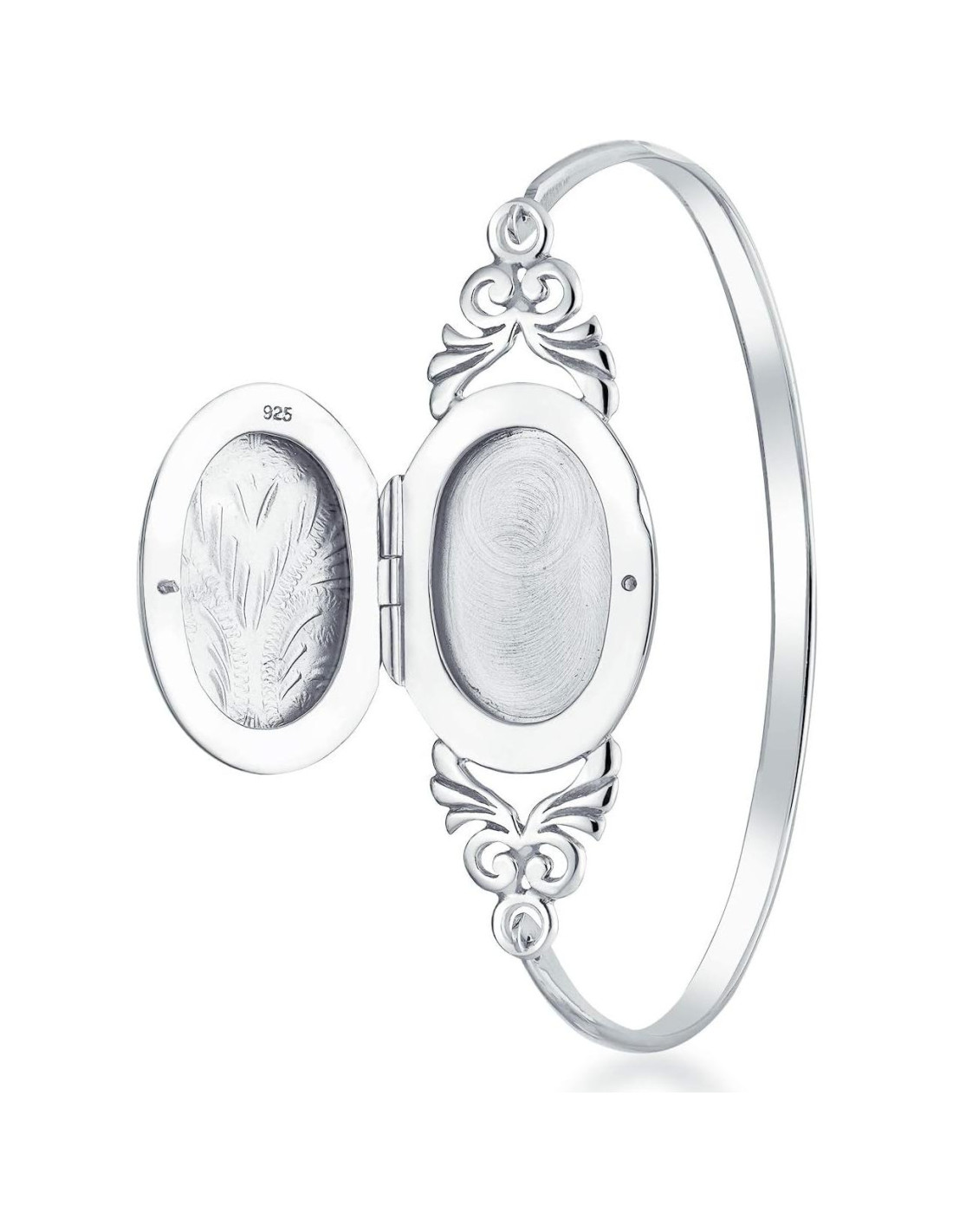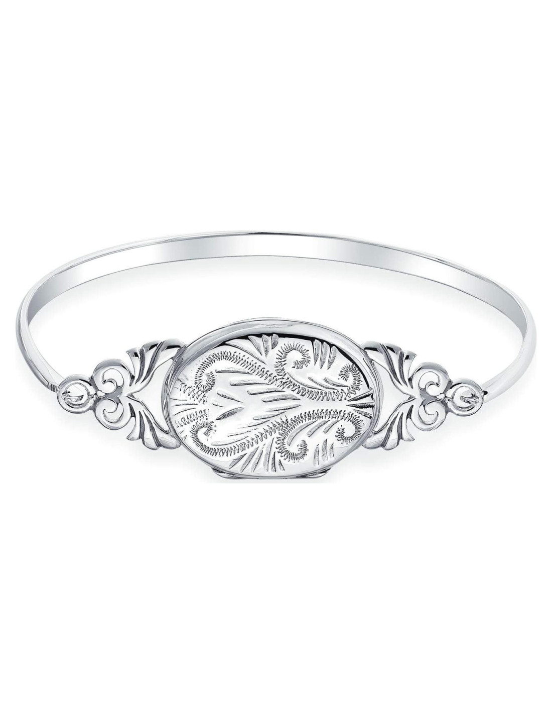 Los medallones han sido atesorados durante siglos, a menudo como collares. Descubre un giro fresco con este impresionante brazalete de medallón. Elaborado en plata esterlina, esta pieza de joyería ligera es fácil de usar y se cierra con un gancho seguro. El medallón único presenta un espacio ovalado para fotos con intrincados diseños de filigrana. La parte posterior cuenta con un acabado suave y brillante, ideal para grabados. Transforma este brazalete de estilo vintage en joyería de recuerdo de cremación añadiendo un mechón de cabello o flores secas. Crea una nueva tradición con este exquisito brazalete.