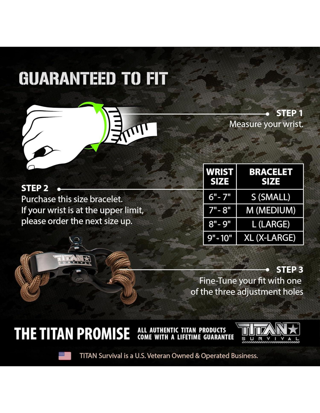 - HECHA CON SURVIVORCORD - Esta pulsera de supervivencia paracord está tejida con más de 3.35 metros de SurvivorCord patentado de TITAN, utilizando un patrón de tejido Trilobite. Eso son 3.5 metros de cordón 550 super fuerte, alambre de utilidad, línea de pesca y yute encerado integrados en una pulsera elegante que siempre tendrás en una situación de supervivencia.