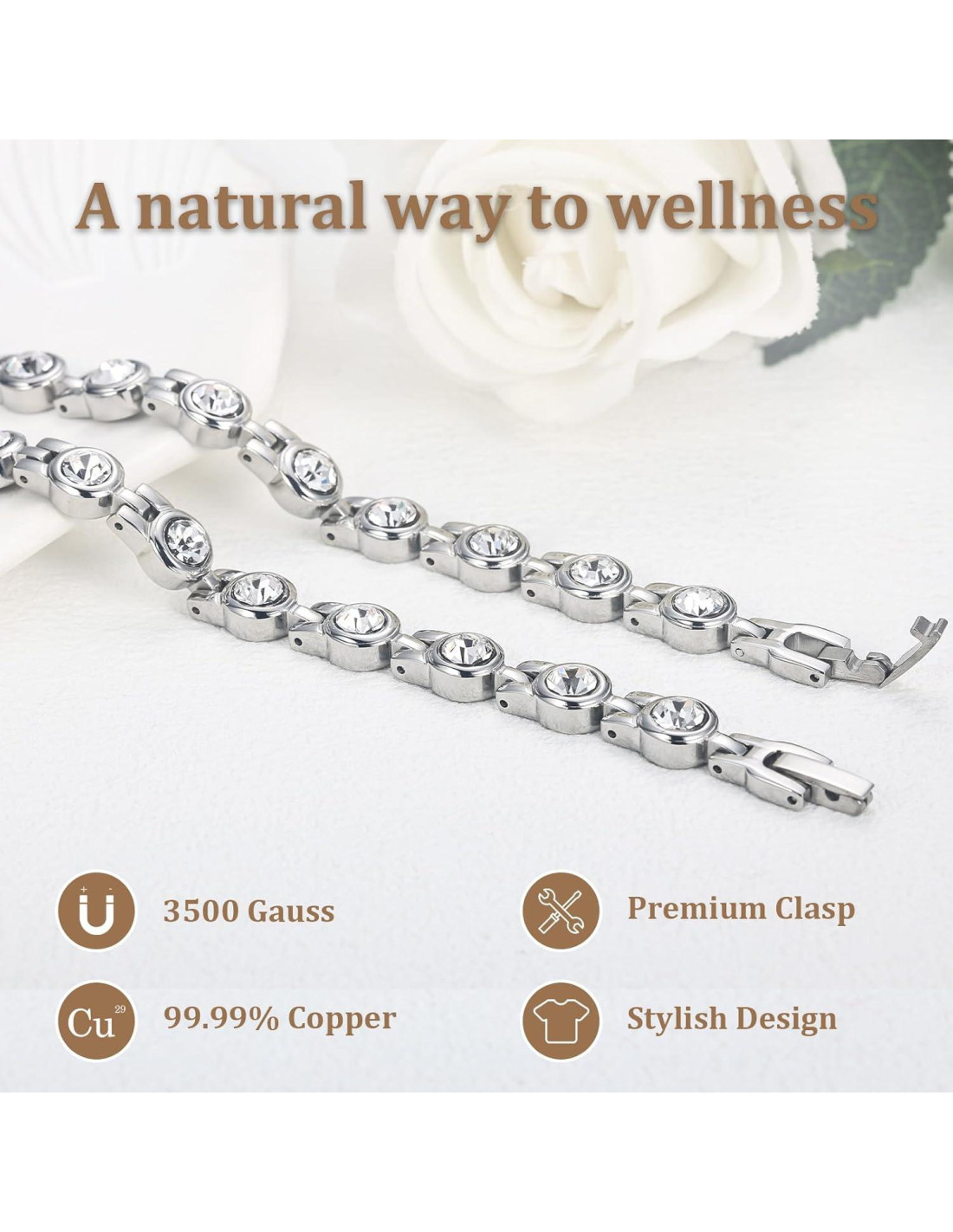 - Pulsera de Acero de Titanio Premium: Esta pulsera magnética para mujeres está hecha de acero de titanio de alta calidad, hipoalergénico, libre de níquel y plomo. Diseñada para pieles sensibles, ofrece una comodidad ligera para un uso prolongado.