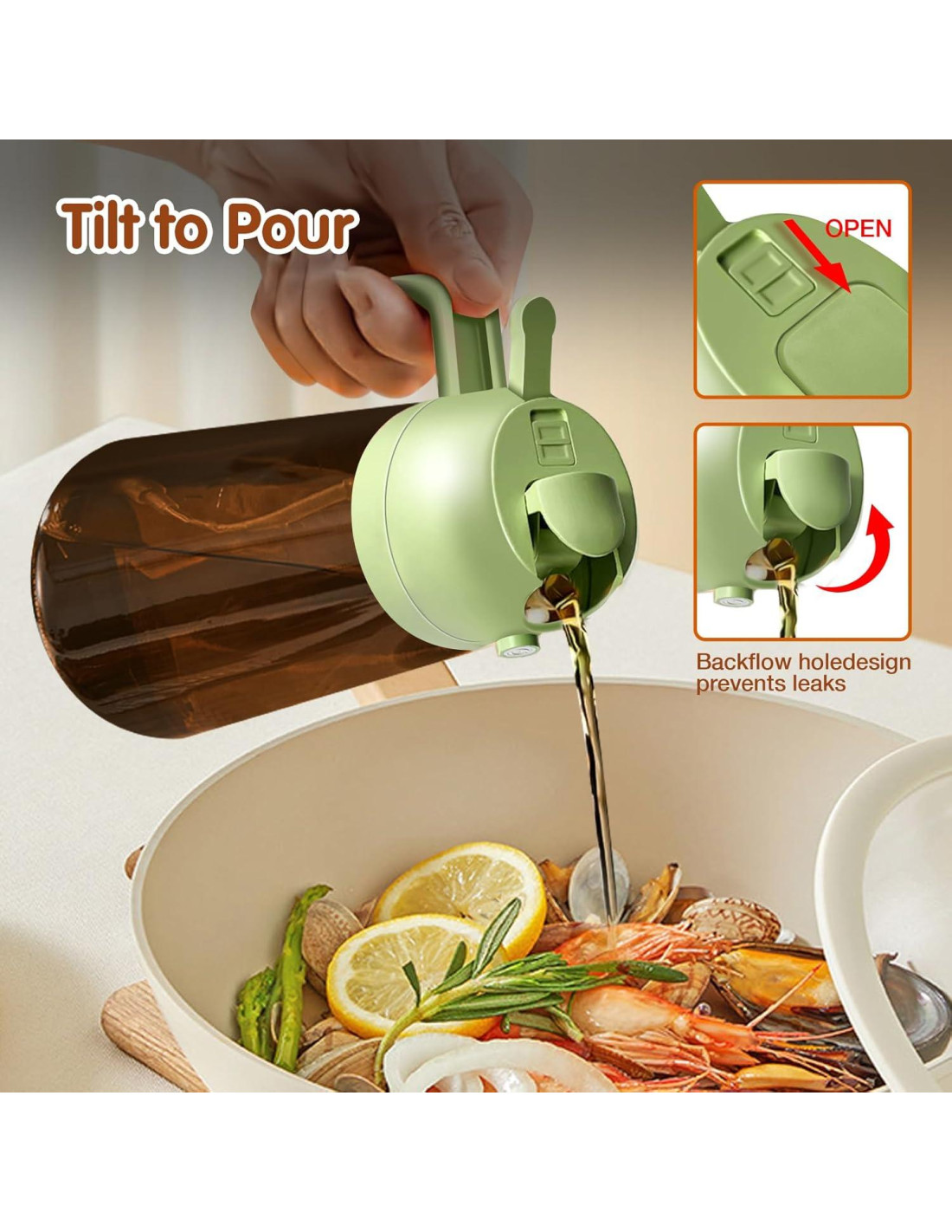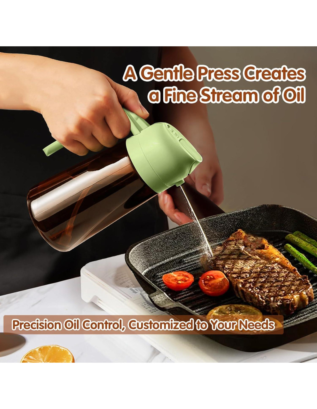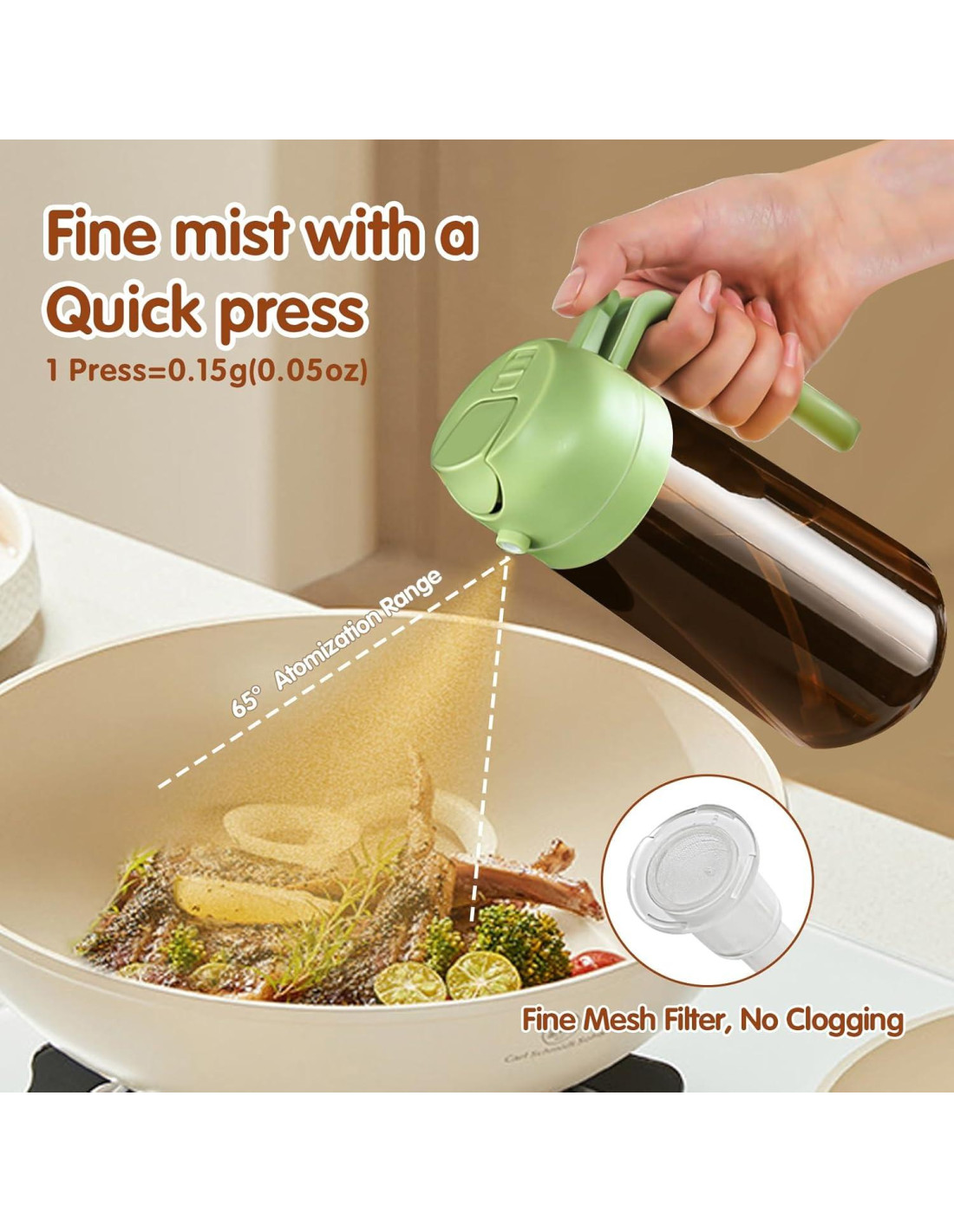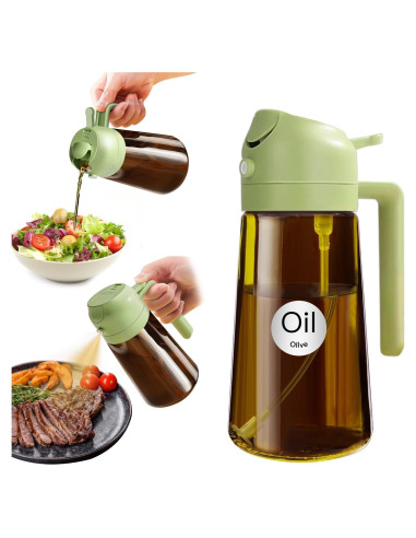 - Control Preciso del Aceite: El dispensador de aceite 2 en 1 y el pulverizador de aceite pueden ayudar a controlar la cantidad de aceite al verter o rociar. Cada pulverización dispensa aproximadamente 0.2 gramos de aceite, lo que es fácil de controlar y medir tu ingesta diaria de aceite.