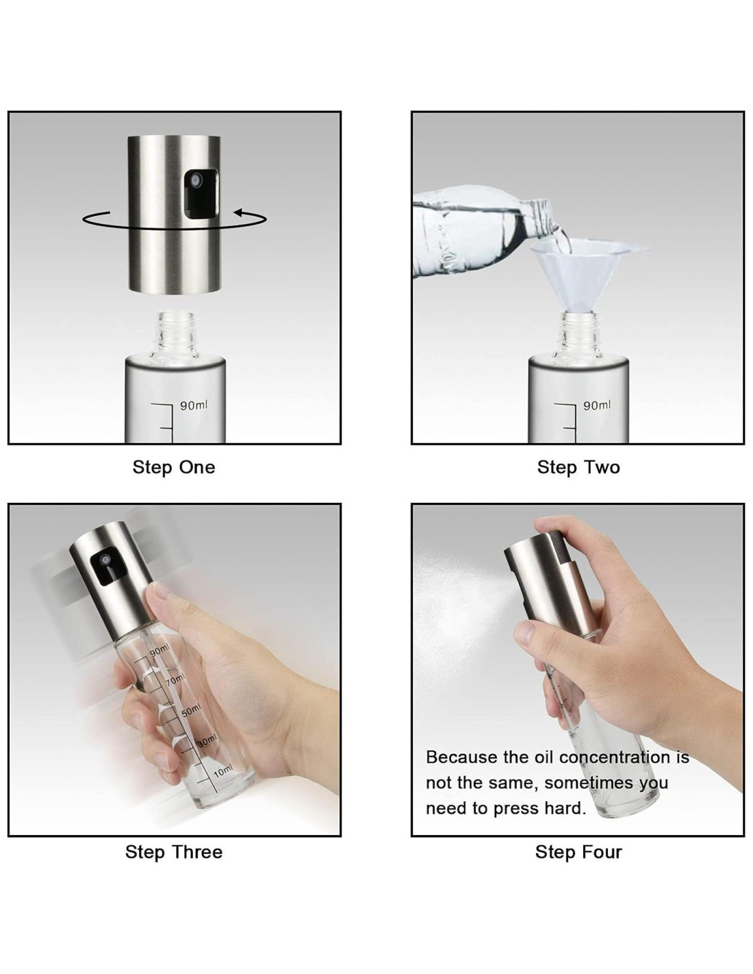 - Fácil de Usar - La botella de pulverizador de aceite de oliva tiene una capacidad de 100ml/3.4 oz, simplemente presiona la bomba del pulverizador para rociar una fina niebla. Como la concentración del aceite es diferente de la del agua, el rendimiento del aceite puede no ser tan bueno como el del agua, te sugerimos que pongas el pulverizador más alto cuando uses aceite de oliva, mantén la botella lo más vertical posible para obtener una mejor forma de niebla. Para asegurar una fina niebla, no la llenes con demasiado aceite y presiona el botón con fuerza hasta el fondo.