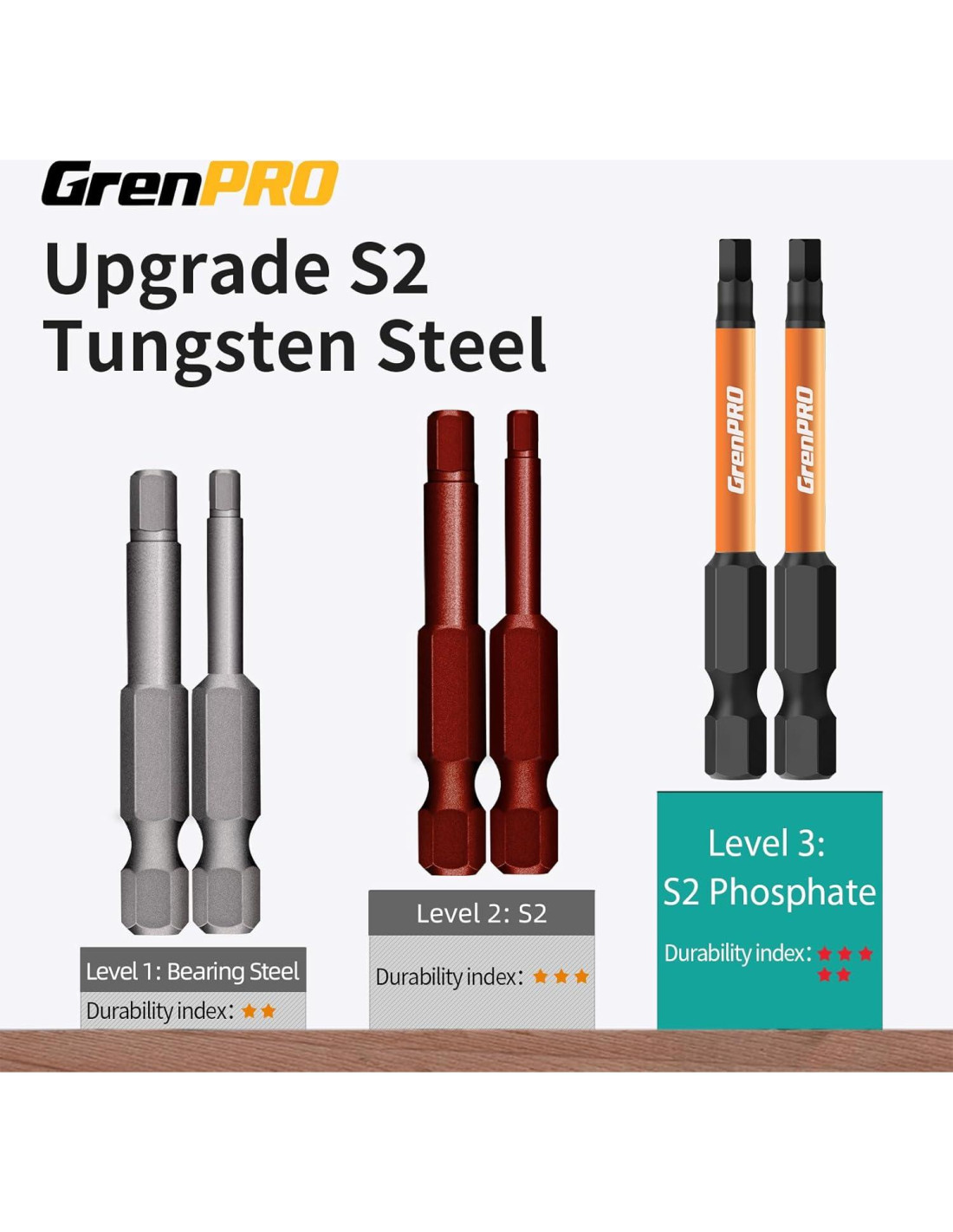- Juego de llaves Allen con zona de torsión para absorber picos de torque y evitar roturas. Juego de Enchufes Allen GrenPRO con una expectativa de vida 15 veces mayor en comparación con brocas estándar. Para destornilladores de impacto y atornillado pesado