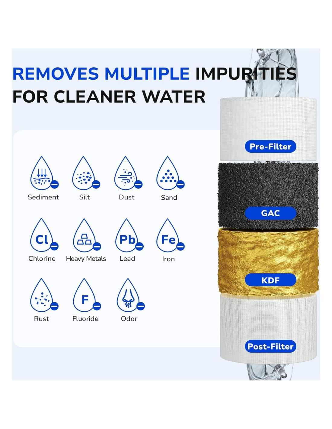 - Filtración de Múltiples Etapas: Sigue un proceso de filtración integral desde la filtración de sedimentos de 20 micrones, GAC, KDF, hasta la post-filtración, reduciendo notablemente sedimentos, cloro, mal sabor, olor y metales pesados