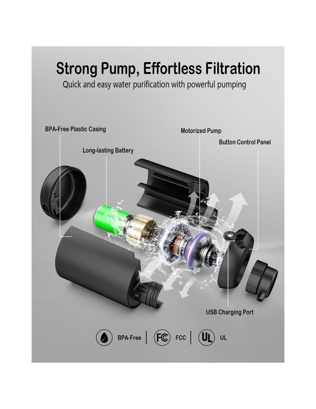 - Rápido y de Larga Duración - Flujo de agua purificada ultra rápido de 700 ml (23 oz.) por minuto. Batería de litio de gran capacidad incorporada, una carga puede purificar 168000 ml (5681 oz.) de agua, suficiente para 10 a 15 días de mochilero y múltiples personas para usar al mismo tiempo. Se puede alimentar de múltiples maneras: suministro de energía móvil, panel solar, suministro de energía del vehículo, etc.