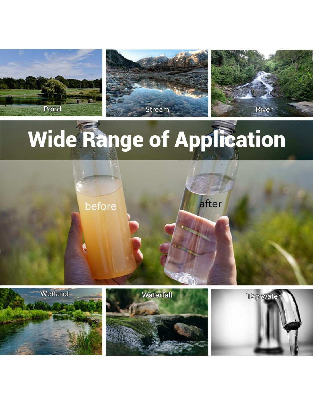 - Amplia aplicación Conecta el filtro de agua a una bolsa de bebida, botellas de agua roscadas, vejiga de hidratación o bebe directamente de fuentes de agua sin usar productos químicos.