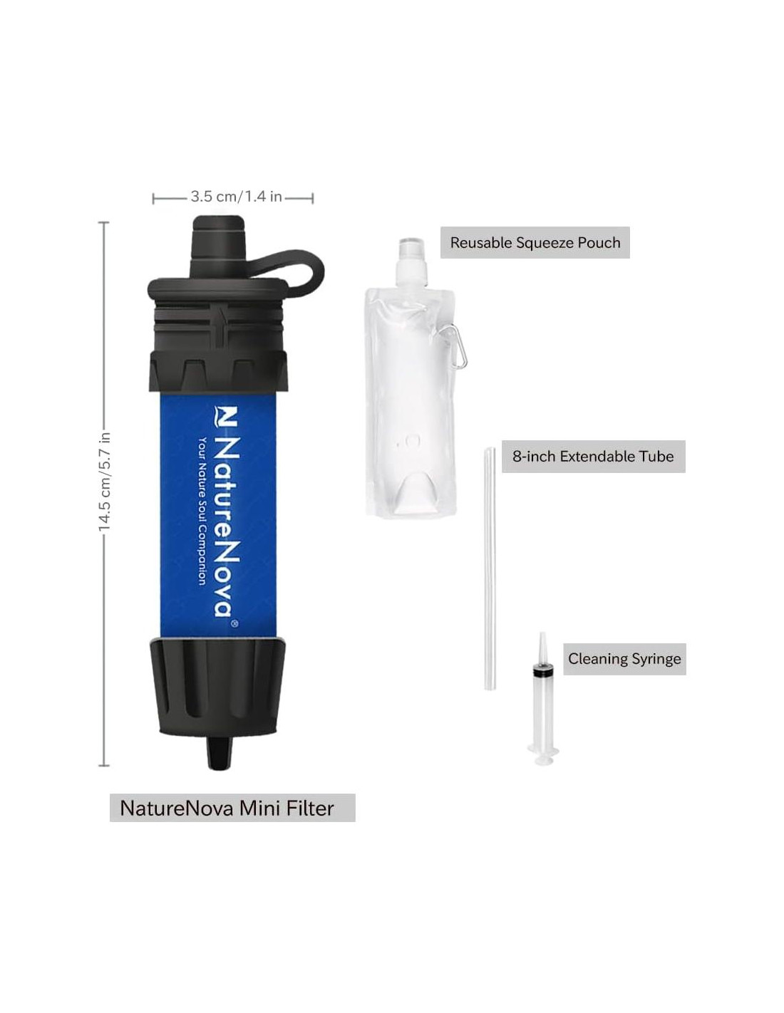 NatureNova es el sistema de filtración de agua personal más ligero y versátil, el Filtro de Agua MINI NatureNova de 51.7 g (1.83 oz) cabe en la palma de tu mano. Con este filtro compacto y fácil de llevar, puedes enroscarlo en una botella de agua de plástico o usarlo con una bolsa de agua como un sistema de gravedad o filtro de cubo, también puedes beber directamente de la fuente de agua con una pajilla, perfecto para una mochila ultraligera, senderismo y camping. También es tu buen compañero para exploraciones, viajes nacionales o internacionales, preparación para emergencias.