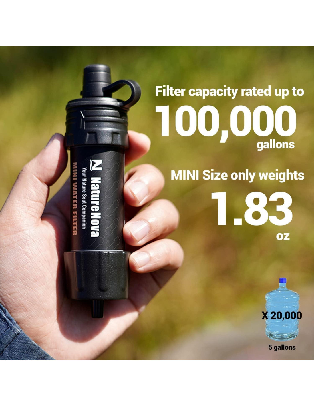 NatureNova es el sistema de filtración de agua personal más ligero y versátil, el Filtro de Agua MINI de 1.83 oz (51.8 g) cabe en la palma de tu mano. Con este filtro compacto y fácil de llevar, puedes enroscarlo en una botella de agua de plástico o usarlo con una bolsa de agua como un sistema de gravedad o filtro de cubo, también puedes beber directamente de la fuente de agua con una pajilla, perfecto para una mochila ultraligera, senderismo y camping. También es tu buen compañero para exploraciones, viajes nacionales o internacionales, preparación para emergencias.