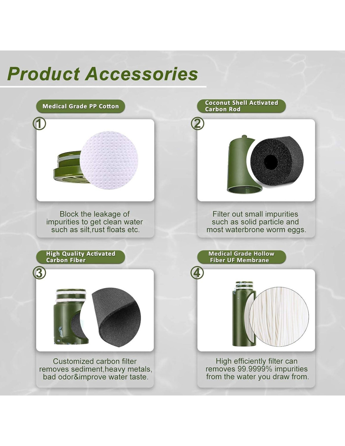 - Sistema de Filtrado Avanzado de Alta Eficiencia de 4 Etapas: 1. Membrana de fibra hueca de grado médico de alto rendimiento, 2. Fibra de carbono activado de alta calidad, 3. Varilla de carbono activado de cáscara de coco, 4. Algodón PP de grado médico. Es portátil, lo que lo convierte en la solución perfecta para la escasez de agua en una emergencia, y puede convertir instantáneamente una fuente de agua cercana en agua potable segura. ¡Imprescindible para viajar, hacer senderismo, acampar y kits de emergencia!