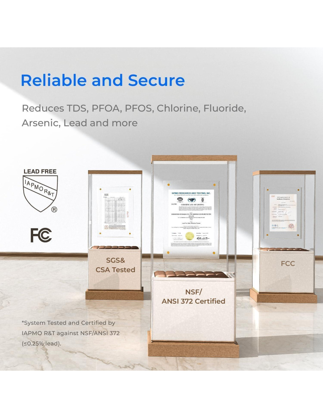 - [ Filtración RO de 6 Etapas ] Certificado por seguridad con el estándar de material libre de plomo NSF/ANSI 58&372 y probado por SGS, el sistema C1 utiliza una membrana RO premium de 0.0001m para reducir TDS, PFOA, PFOS, cloro, fluoruro, arsénico, plomo y más, proporcionando agua saludable.