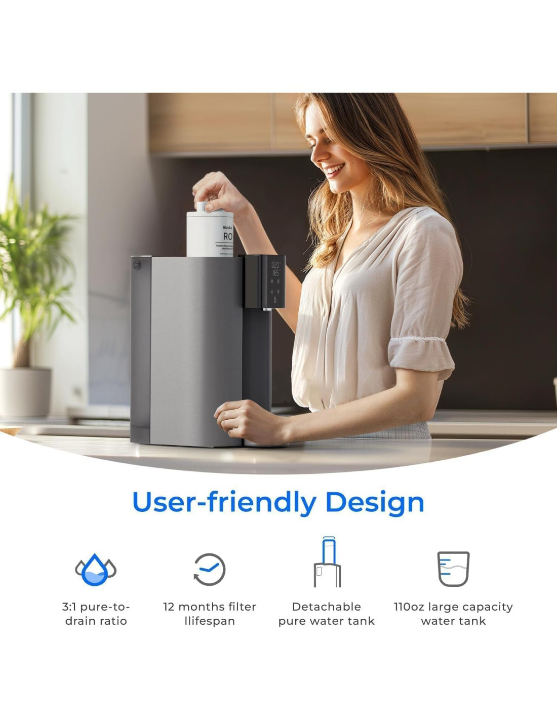 - [ Calentamiento Instantáneo 3S ] Revoluciona tu vida con el sistema de ósmosis inversa de encimera, que cuenta con tecnología de calentamiento de vanguardia para un calor instantáneo de 3 segundos. Perfecto sin esfuerzo para té relajante, café refrescante y más, su conveniencia redefinida. Además, una botella de vidrio para una hidratación elegante.