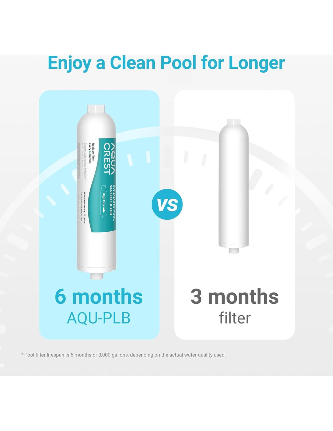 - LARGA DURACIÓN: Disfruta de pureza duradera en tu RV o piscina con el filtro AQU-PLB, que ofrece hasta seis meses o 8,000 galones (30,283 litros) de servicio, 6 veces más que los filtros estándar para RV. Experimenta menos inconvenientes y costos más bajos con AQUA CREST. Nota: No es adecuado para agua de pozo.