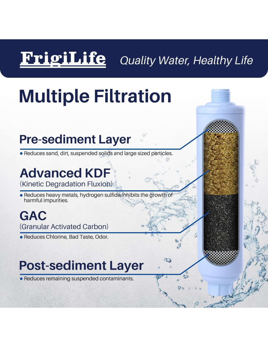 - Filtración Múltiple y Mejorada - El filtro de agua RV FrigiLife adopta una capa de sedimento de alta calidad, KDF avanzado y carbón activado granular avanzado, asegurando un rendimiento de filtración de alta eficiencia. Reduce efectivamente arena, suciedad, sólidos suspendidos, partículas de gran tamaño, metales pesados, sulfuro de hidrógeno, fluoruro, cloro, mal sabor y olor.