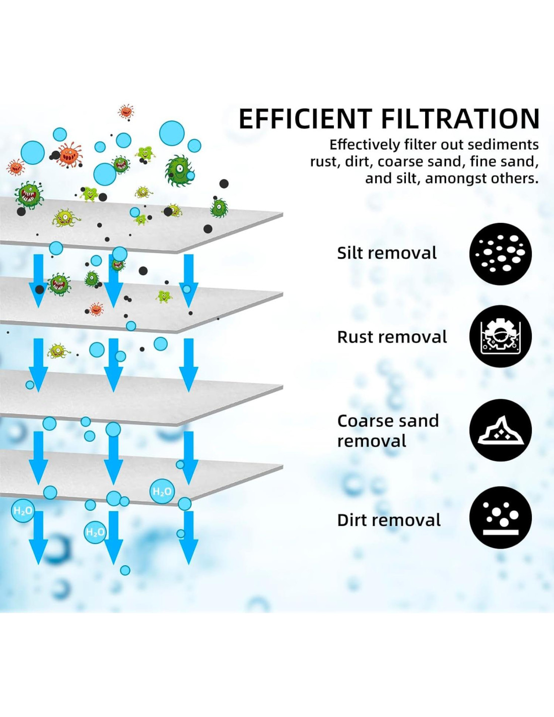 - Filtro de sedimentos de 1 micrón: material de algodón de polipropileno PP de grado alimenticio. Alta densidad de fibra, buen rendimiento de compresión, sin necesidad de aditivos, más seguro y más higiénico de usar. Tiene un excelente rendimiento de adsorción para arena, limo, óxido y sólidos suspendidos en el agua.