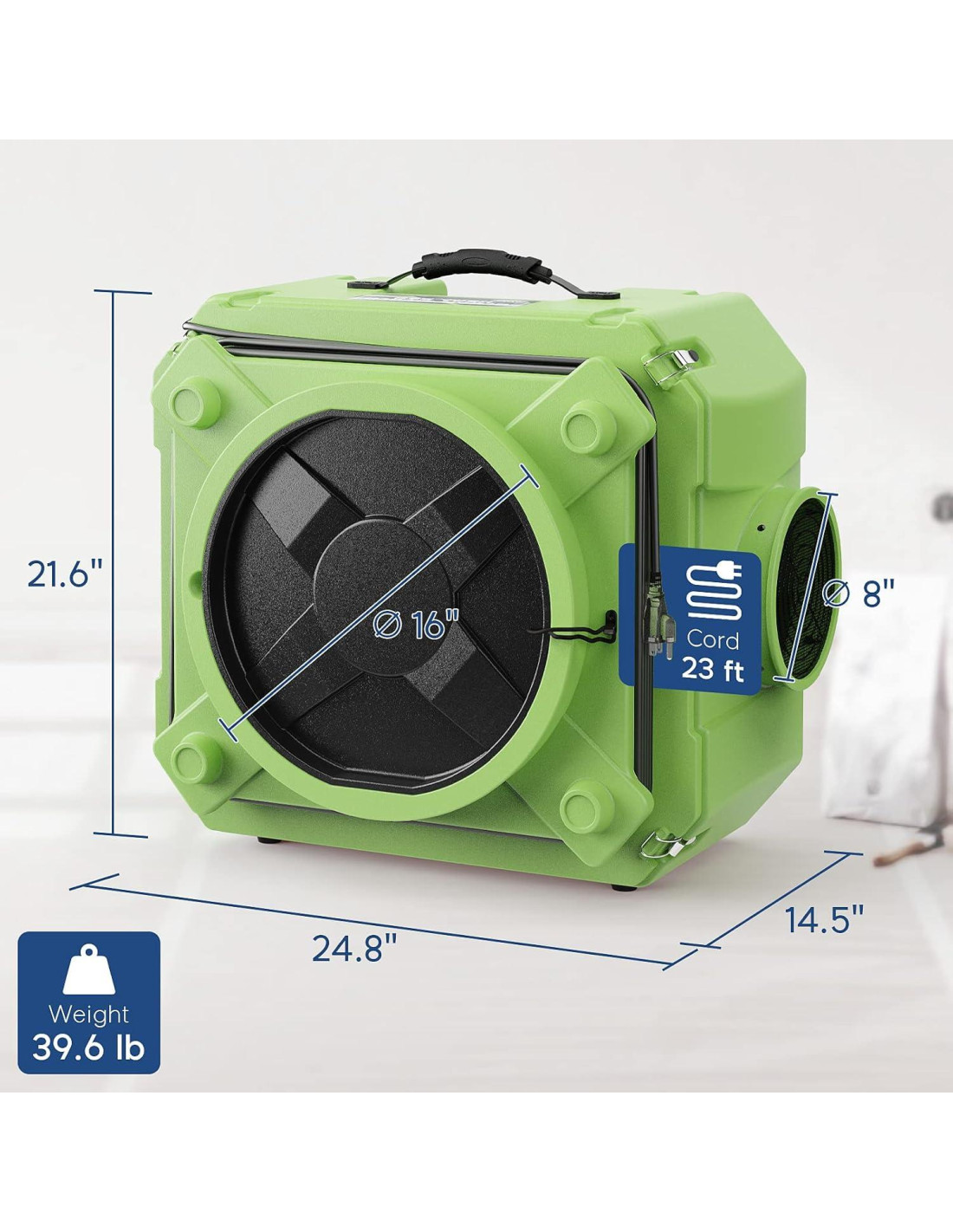 - Purificador de Aire Portátil: La máquina de aire tiene un mango para que sea fácil transportar el purificador de aire de una habitación a otra. Conectar y usar, no olvide eliminar la cubierta negra antes de usar esta máquina. Compatibilidad de ductos (opcional) 40.6 centímetros para la entrada de aire y 20.3 centímetros para la salida de aire, no incluido.