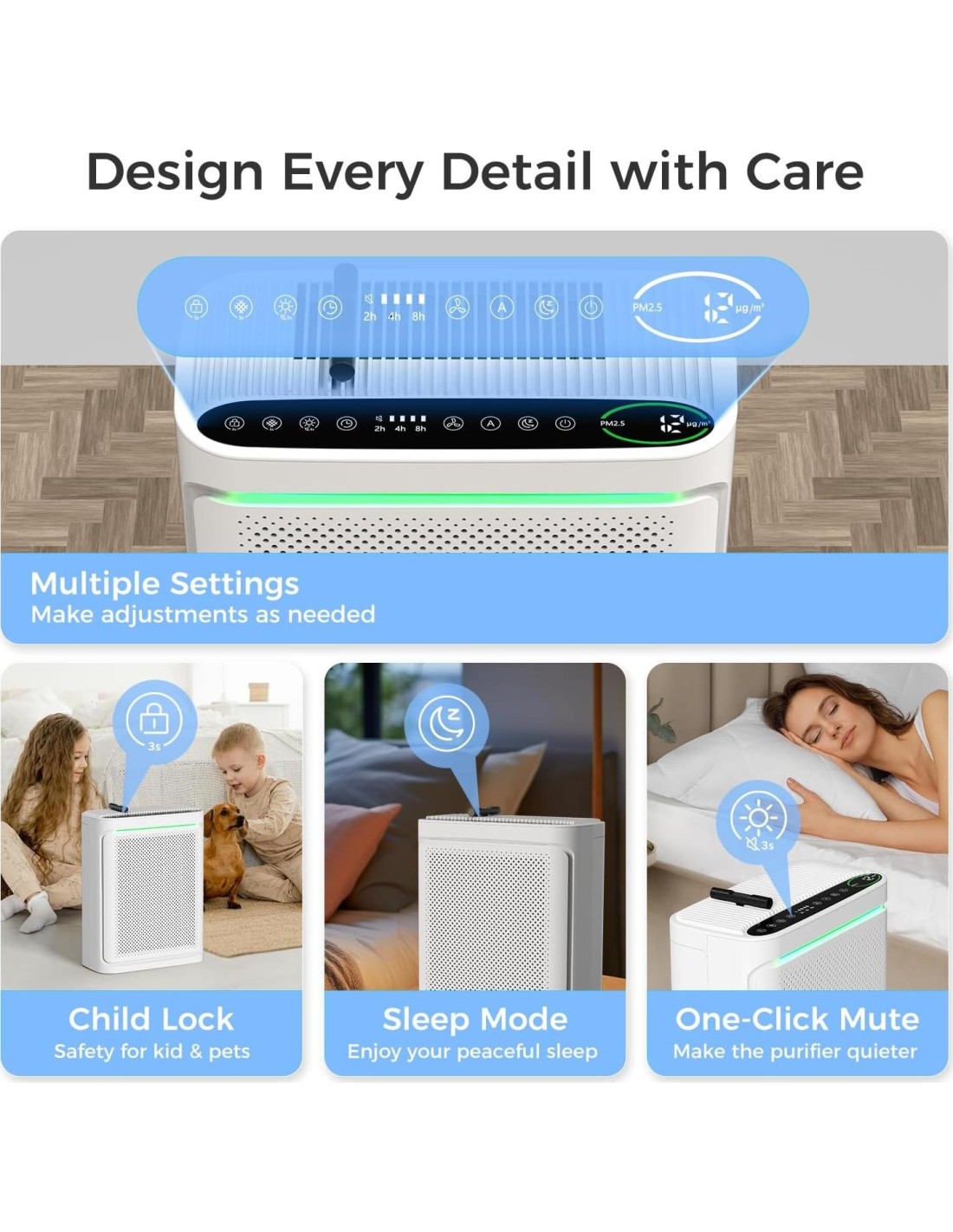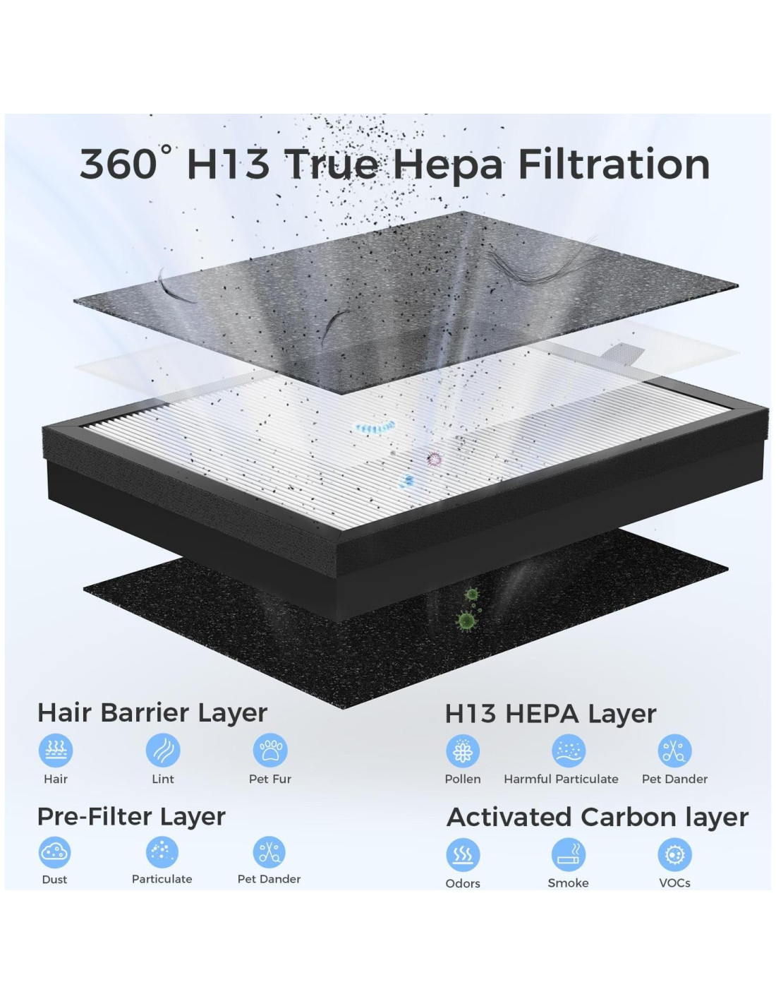 - Filtración HEPA Verdadera H13: El avanzado sistema de filtración de cuatro capas H13 HEPA logra una tasa de captura del 99.97% para partículas tan pequeñas como 0.3 micrones y también tiene un excelente efecto de interceptación en partículas tan pequeñas como 0.1 micrones. Elige nuestro purificador y haz que tu espacio vital sea más puro y vibrante.
