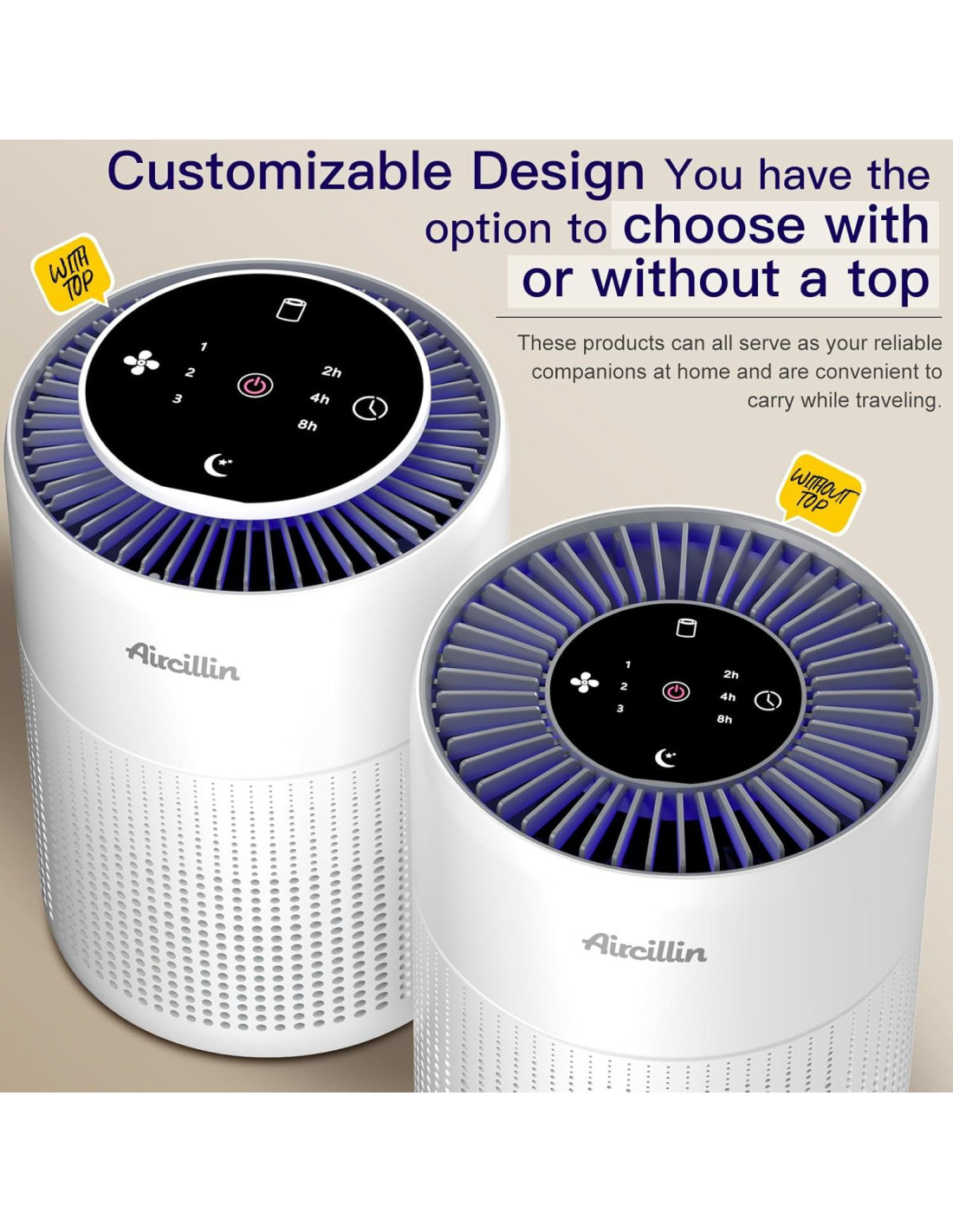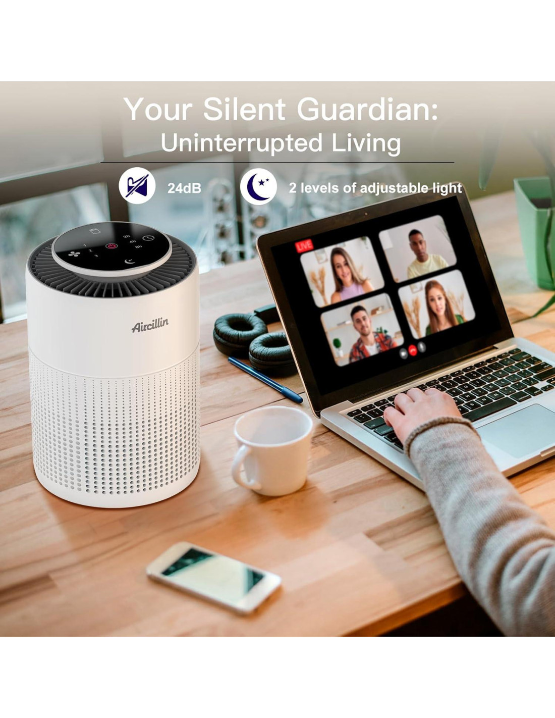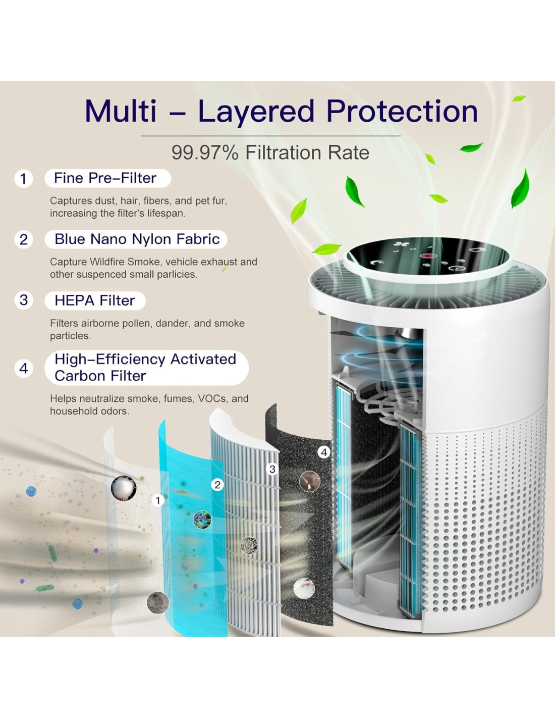 - Filtración eficiente 4 en 1: El filtro hepa de los purificadores de aire Aircillin consiste en 4 capas: pre-filtro, tela de nylon nano azul, filtro HEPA y filtro de carbón activado. El pre-filtro del purificador de aire para el hogar puede capturar eficazmente polvo, pelo de mascotas, etc. El filtro HEPA de Aircillin es capaz de capturar el 99.99% de las partículas en el aire tan pequeñas como 0.1 micrones, incluyendo suciedad, polen y caspa de mascotas. El filtro de carbón activado elimina olores y purifica el aire del humo, como el humo de fumar o incendios forestales.
