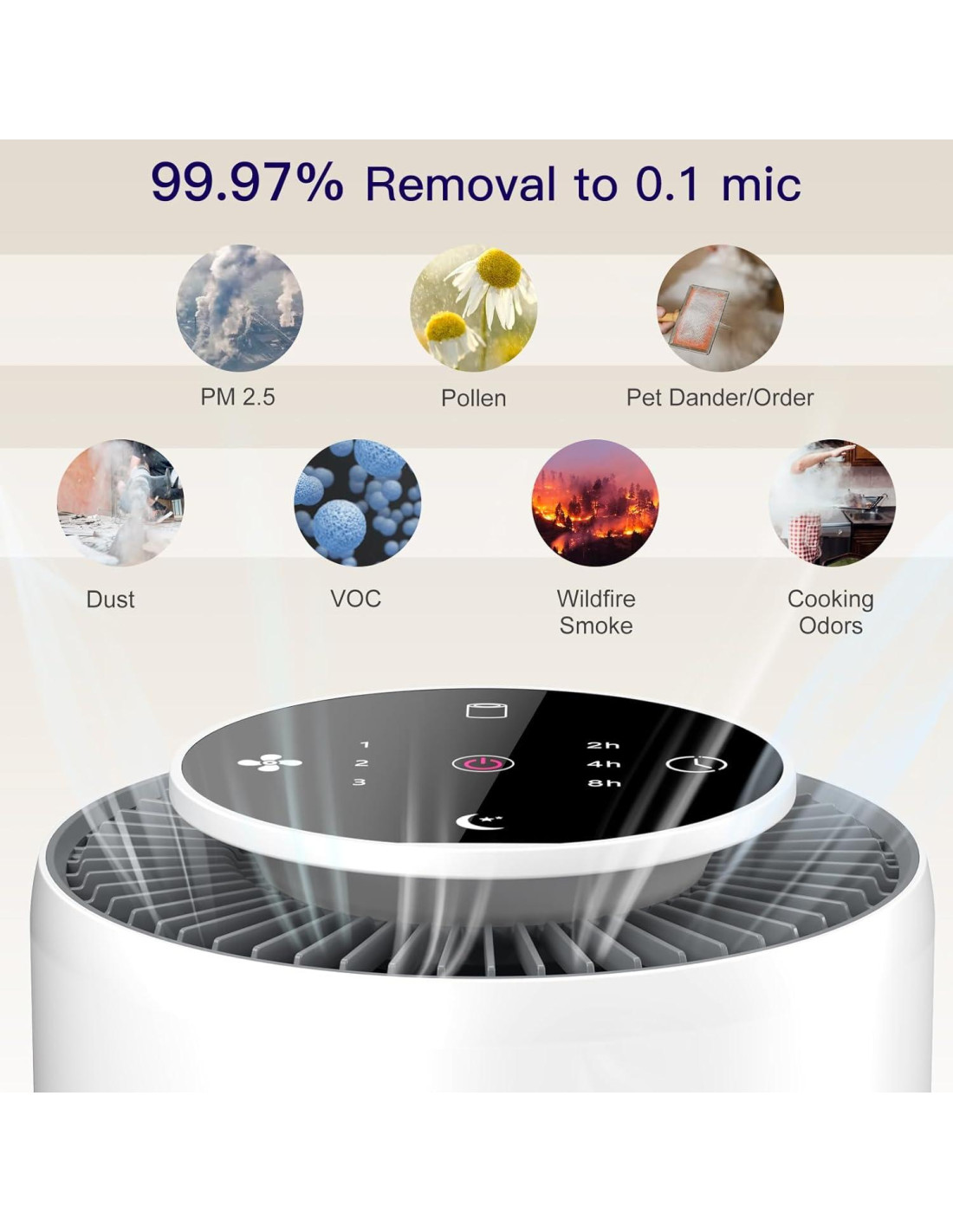 - Pantalla Táctil LED con Funciones Completas: 3 velocidades de viento: Cuanto más rápida sea la velocidad del viento, mayor será la eficiencia de purificación. Función de temporizador: Puedes elegir entre modos de temporizador de 2 horas, 4 horas u 8 horas. Botón de modo nocturno: Haz clic una vez para apagar la luz decorativa y ajustar el brillo del botón al 50%. Botón de recordatorio de filtro: Cuando la vida del filtro HEPA es <10%, el indicador de reemplazo del filtro HEPA parpadeará para recordar al usuario reemplazar el filtro HEPA del purificador de aire, típicamente cada 3-6 meses.