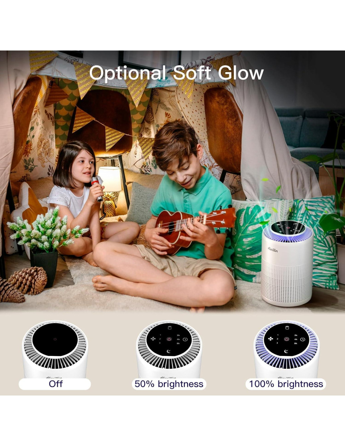 - Experimenta un sueño reparador y completamente ininterrumpido: El nivel de ruido no excede 23 dB en modo de sueño. Los botones en el panel LED se pueden ajustar para el brillo a brillo completo, 50% de brillo o completamente apagado. Puedes elegir encender o apagar el suave resplandor dentro del purificador de aire hepa para crear una atmósfera cómoda.
