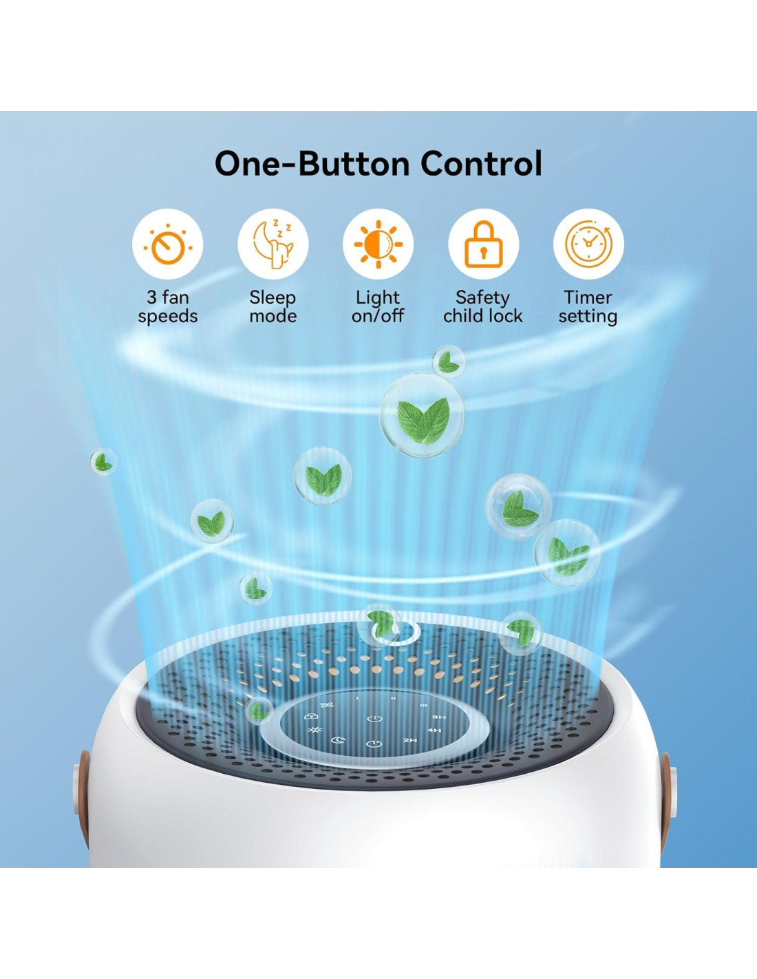 - Luz Nocturna Sutil y Bloqueo para Niños: Mejore su ambiente con nuestra función de luz nocturna incorporada. Si prefiere un entorno más oscuro con el purificador de aire para dormitorio, también puede apagar las luces. Nuestro pequeño purificador de aire viene con un modo de bloqueo para niños, ofreciendo tranquilidad para familias con pequeños curiosos. Active esta función para evitar ajustes no intencionados.