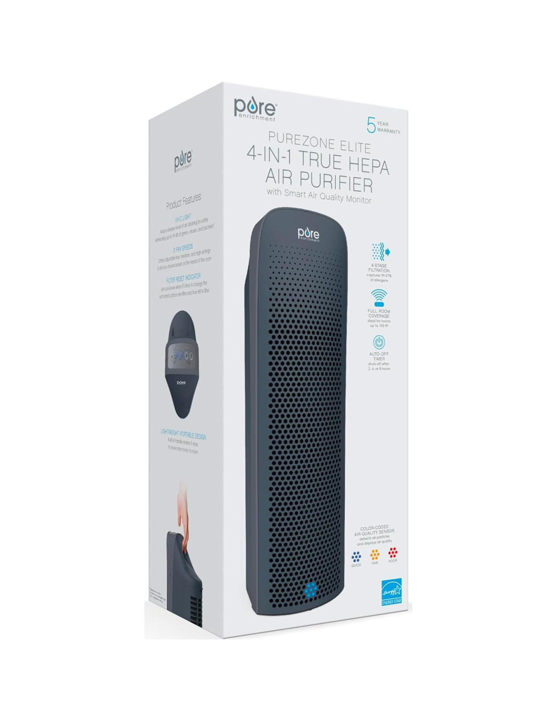 - Eficiente en Energía y Fácil de Usar: PureZone Elite utiliza una tecnología de detección de calidad del aire que ajusta automáticamente las tres velocidades del ventilador en tiempo real, manteniéndote informado con nuestra pantalla de luz codificada por colores. Nuestra calificación Energy Star utiliza menos electricidad mientras ayuda a proteger el medio ambiente. También hay un indicador de reinicio de filtro que te avisa cuando es hora de cambiar el filtro de pre-carbono activado y el filtro HEPA verdadero de grado médico.